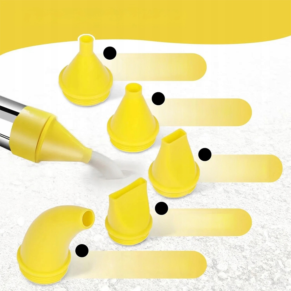 Поєднує в собі міцну конструкцію (нержавіюча сталь + ABS-пластик), 5 змінних насадок для різноманітних завдань і ергономічний дизайн, що забезпечує рівномірний розподіл матеріалу, економію праці та легке очищення після використання.