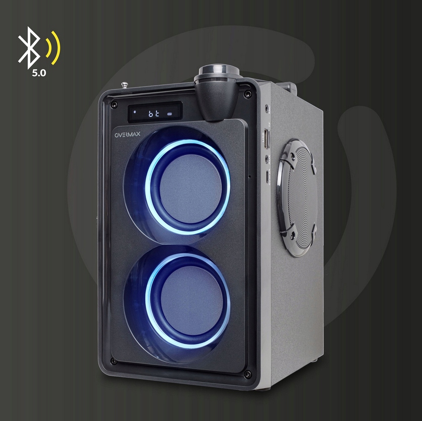 Бездротова колонка Overmax Soundbeat 5.0 оснащенадвома високоякісними колонками загальною потужністю 20 Вт RMS. Динаміки підтримуються пасивними випромінювачами, які додають глибини низьким тонам, забезпечуючи потужний ефект низьких частот.