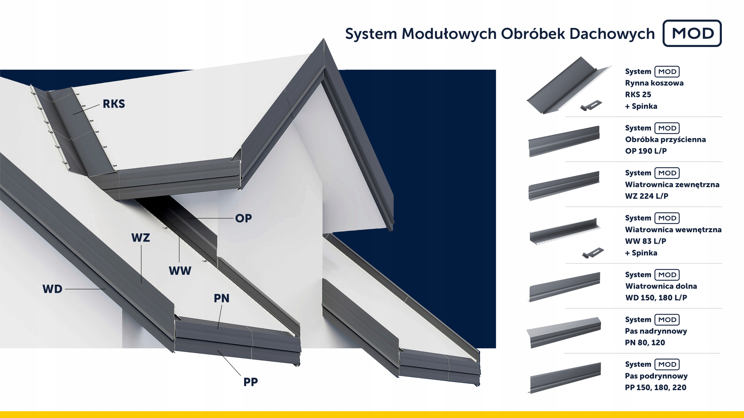 Модульна система обробки даху MOD є єдиним рішенням такого типу на польському ринку даху. Універсальний, адаптований до багатьох типів покрівельних покриттів, забезпечуючи ідеальне покриття даху, скорочуючи час монтажу та гарантуючи його довговічність та унікальну естетику.