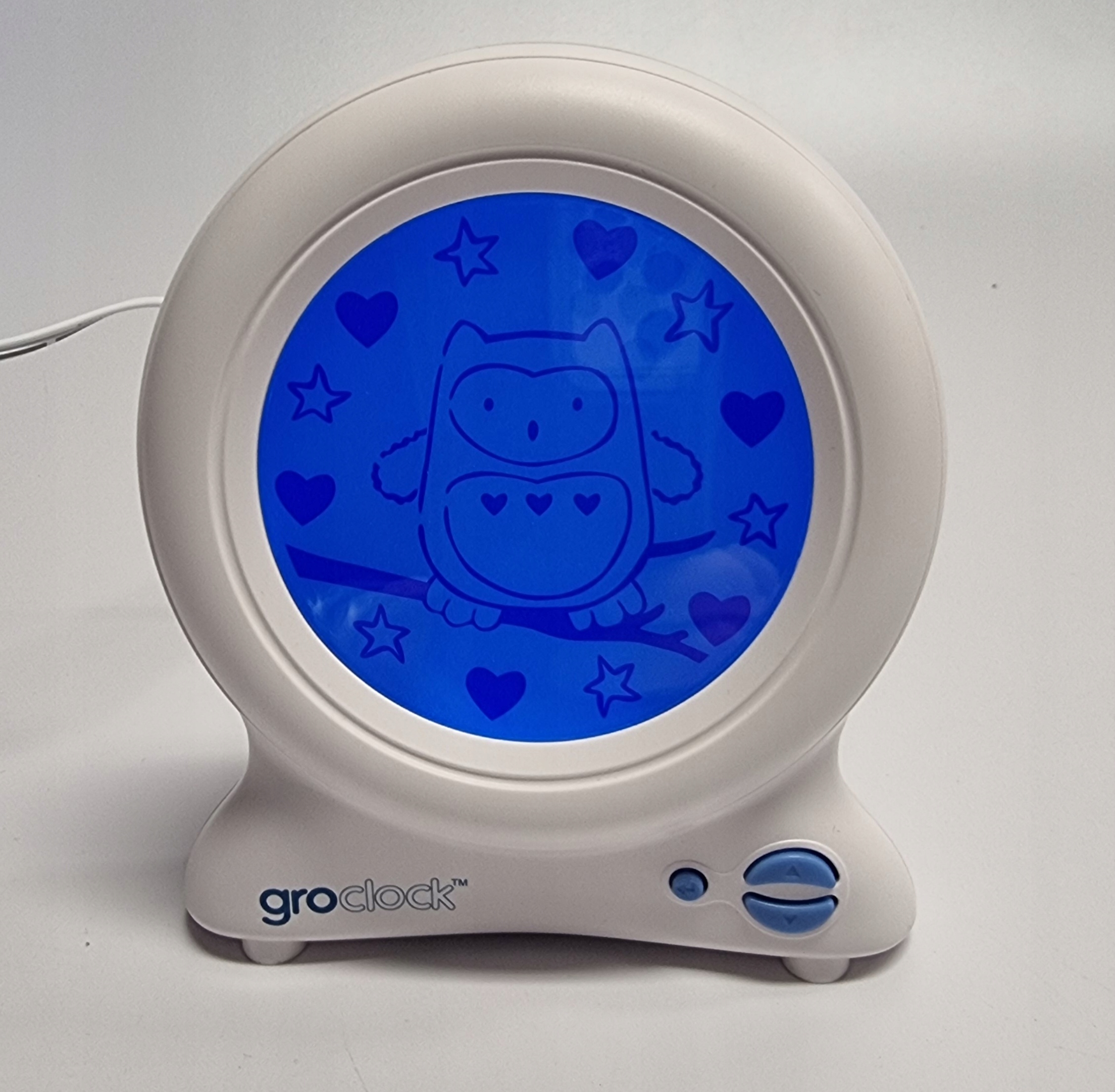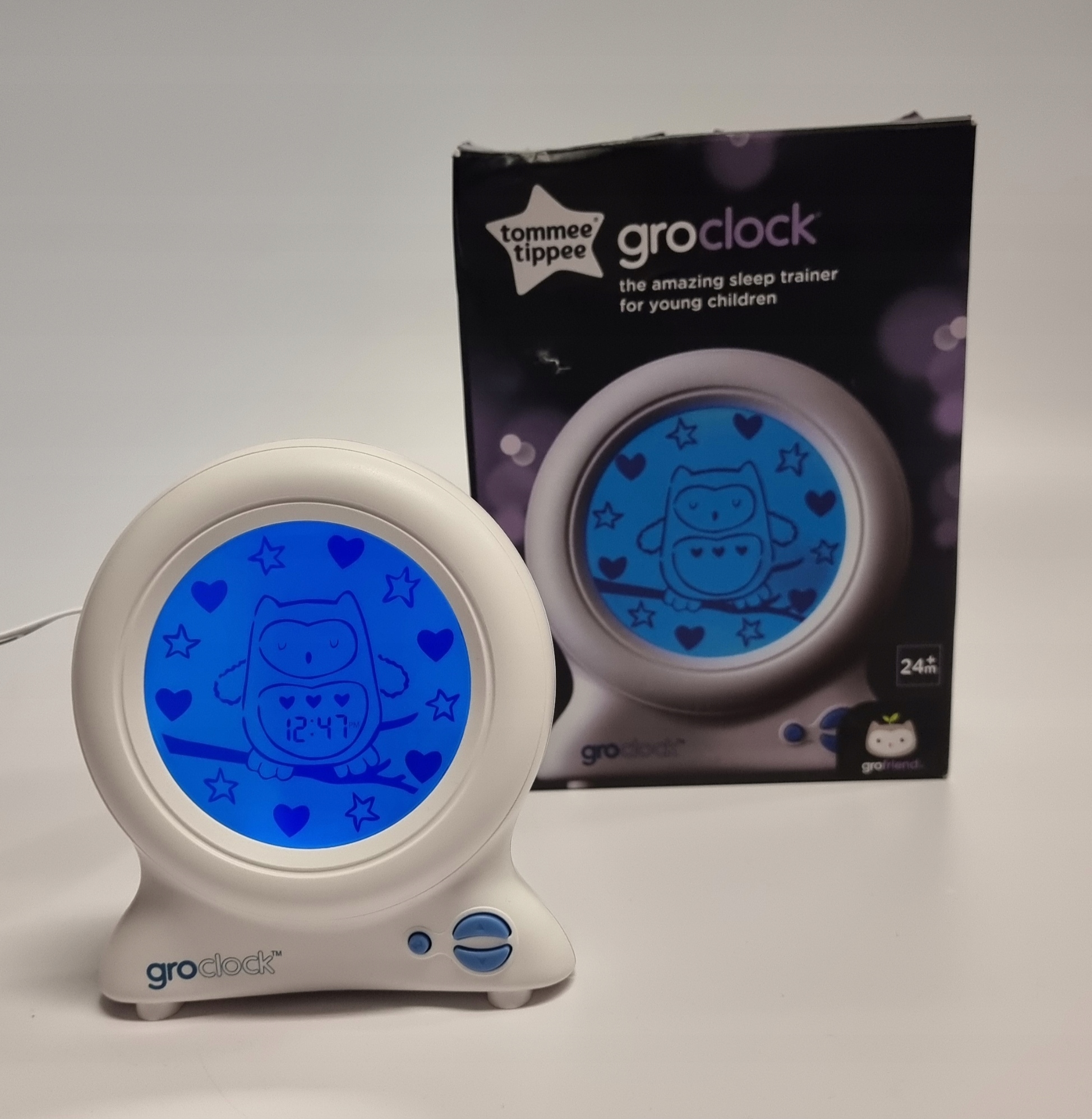 Наш тренажер для сну Tommee Tippee Groclock показує, як сова Оллі спить і прокидається, щоб передати час «сну» і «прокидання». У комплект входить весела книжка-розповідь перед сном під назвою «Небо, повне снів», у якій пояснюється, як працює groclock через Оллі та його друзів, і заохочується їх довше залишатися в ліжку. Зірки та сердечка відображаються на тренажері для сну вночі або під час сну, щоб показати плин часу Опція блокування клавіш, регульована яскравість екрана та додаткова функція звукового сигналу Живлення від мережі (адаптер у комплекті), підходить для дітей від 2 років