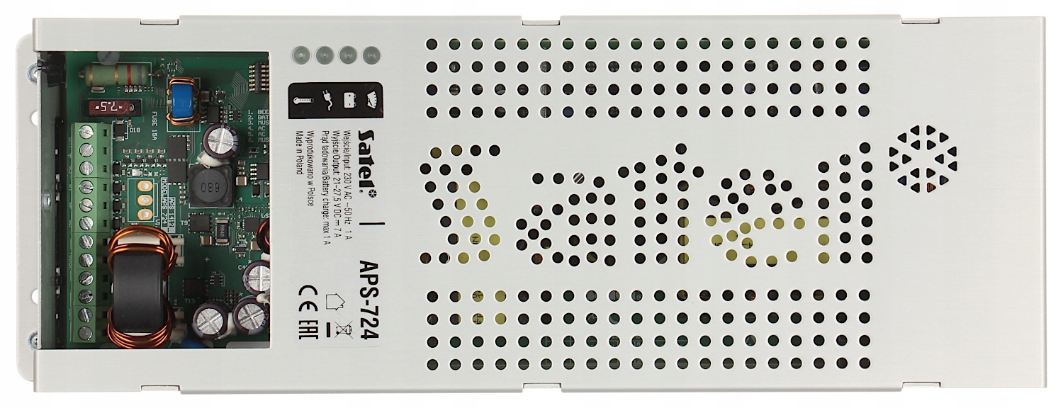 Блок живлення буфера призначений для подачі панелей управління сигналами, датчики, шифрових замків, камер, маніпуляторів, домофонів та інших пристроїв, що входять до системи сигналізації. APS-724 має виділений роз'єм, який дозволяє працювати з пристроями Satel.