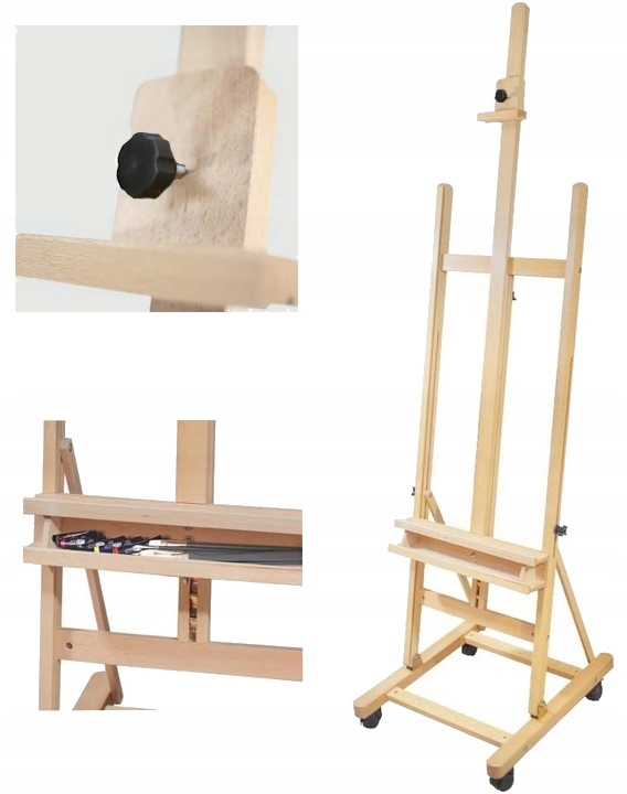 - Мольберт виготовлений із твердої деревини та є призначений для підрамників з висотою полотна до 130 см. Це робить його придатним не лише для малювання, але й як презентаційний мольберт, наприклад, для весілля чи інших заходів. , 9,5 кг) має подвійну кришку і забезпечує стійке кріплення рами. Завдяки чотирьом коліщаткам, що замикаються, його можна гнучко пересувати.