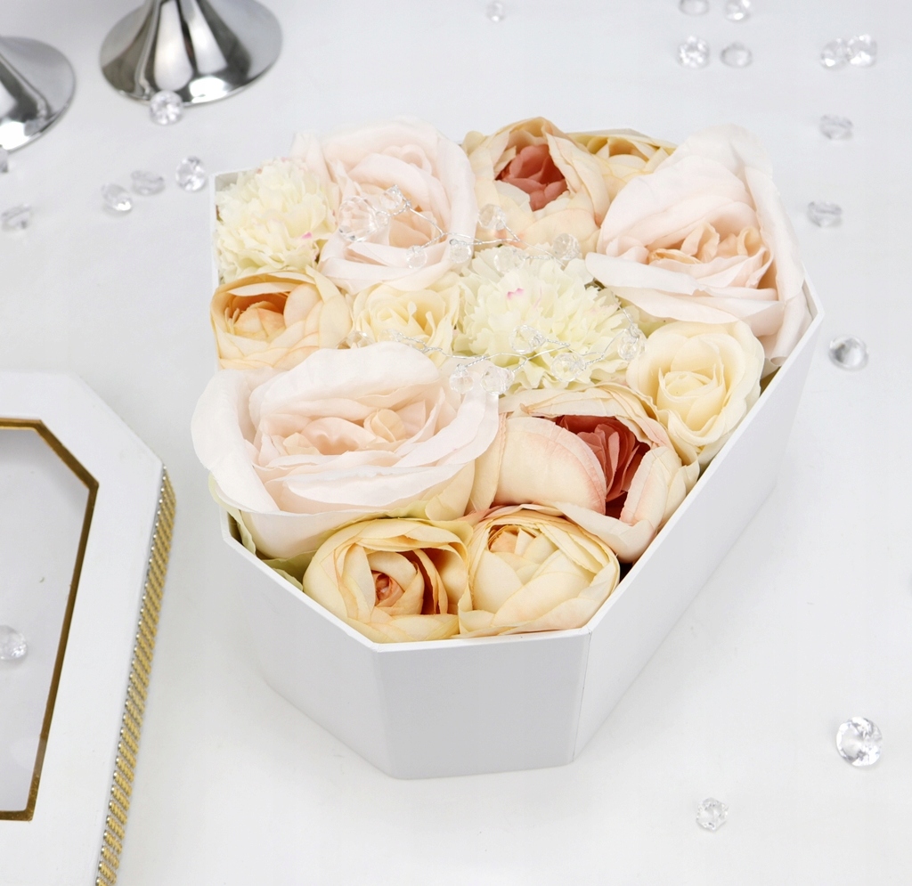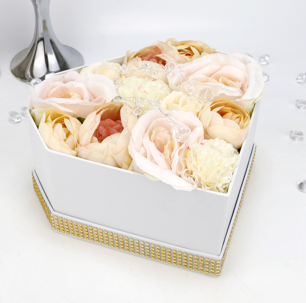 ГОТОВИЙ ВІЧНИЙ БУКЕТ "FlowerBox" - в білій ромбоподібній коробці з пудрово-кремовими атласними квітами - накритий декоративною кришкою з написом "Just for you"