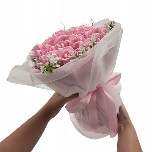 Цей букет з 33 мильних пелюсткових троянд зі світлодіодним підсвічуванням - ефектна та довговічна прикраса, яка чудово підійде як на подарунок, так і як прикраса інтер'єру. Кожна квітка зроблена з реалістичних мильних пластівців, внутрішня частина яких заповнена серцевиною з пінополістиролу, забезпечуючи стабільність і форму. Композицію доповнюють тюль і декоративний папір, створюючи розкішний візуальний ефект. Світлодіодні світильники можна обернути навколо букета самостійно, регулюючи інтенсивність і розташування світла. Живлення від батарейок (входять в комплект), що робить букет готовим до негайного використання. Це елегантний аксесуар, який захоплює своїм тонким кольором, м’якою текстурою та довговічністю.