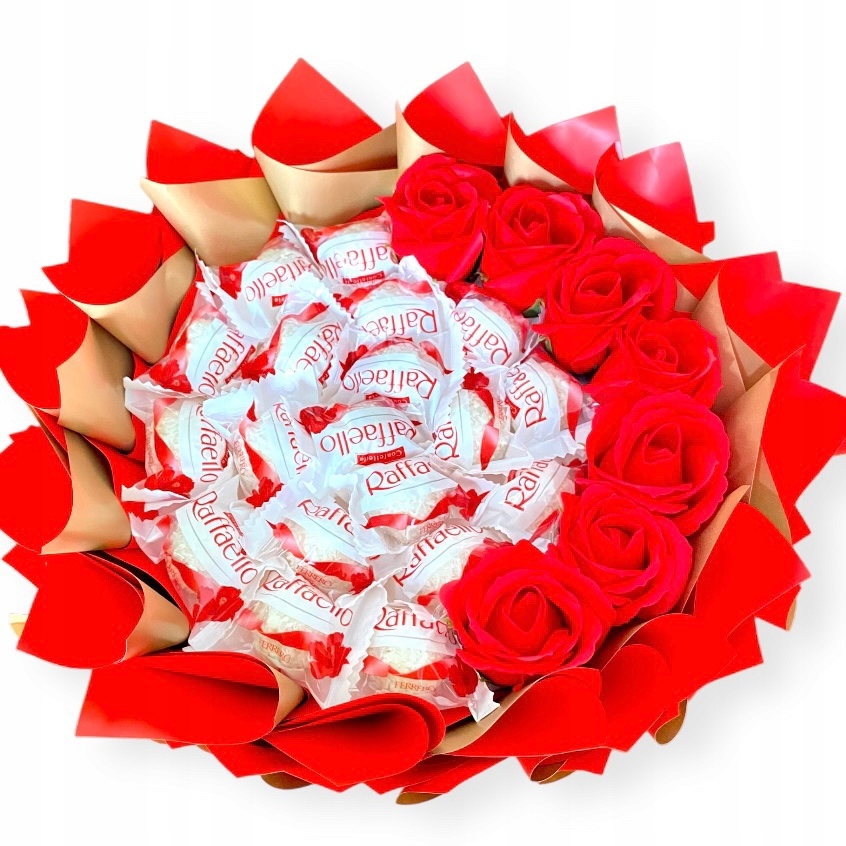 - Складається з 19 праліне Raffaello та 7 мильних троянд