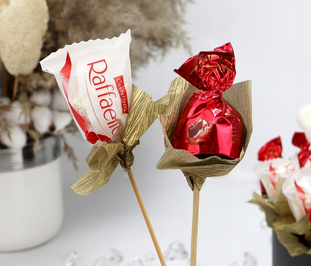 Кожне праліне прикріплено на палички та декоративний золотий папір. Їх легко витягнути та розпакувати.