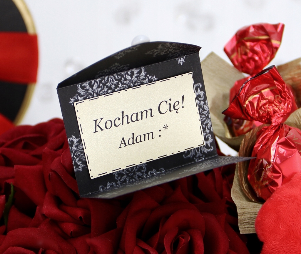 Все це естетично упаковано в коробку FlowerBoxу формі серця, чорного кольору із золотими вставками. Коробку накриває кришка з красивим подвійним червоним бантом зав'язаний на ньому. Кришка має спеціальне кріплення, щоб нічого не здавити.