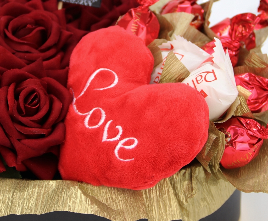 Поруч із квітами та праліне ми розмістили велике плюшеве серце червоного кольору з написом " Любов» b> - кріпиться на паличку, яку можна витягнути.