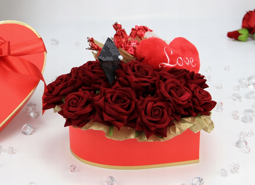 Букет преміальних оксамитових троянд у комплекті з праліне, плюшевим СЕРЦЕМ, листівкою з вашою присвятою - все це естетично завершено в елегантному Коробка у формі СЕРЦЯ, закрита кришка з бантом