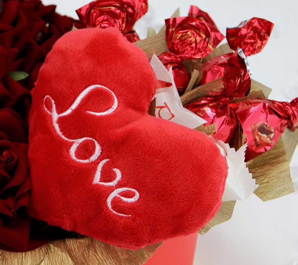 Поруч із квітами та праліне ми розмістили велике плюшеве серце червоного кольору з написом " Любов» b> - кріпиться на паличку, яку можна витягнути.