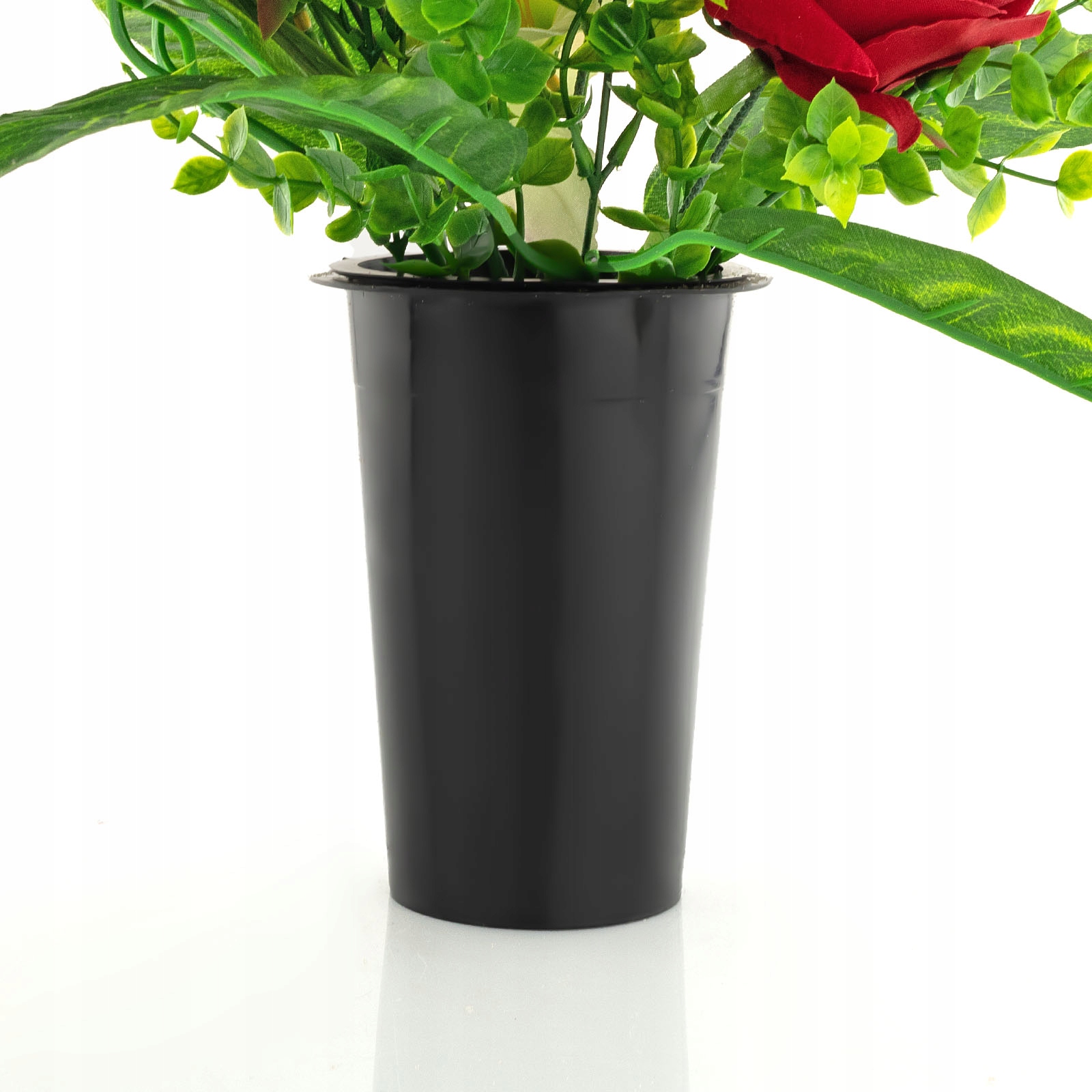 Квіти розміщені у флористичній губці, а губка у вставці чорної вази.