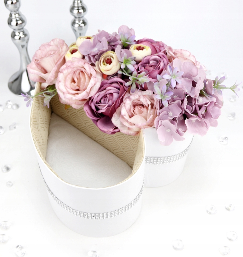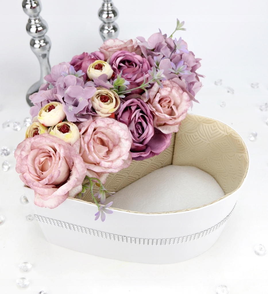 Основа букета, тобто коробка, з більшої серії, у формі серцяоднорідного білого кольору. Одна сторона коробки заповнена квітами, інша сторона підготовлена як місце для подарунка - доповнення до квітів. Вся ця частина обшита кремовим флізеліном на стінах і білою подушкою знизу. Сюди можна легко помістити пляшку, наприклад, маленького вина, цукерки, або будь-який інший невеликий подарунок.