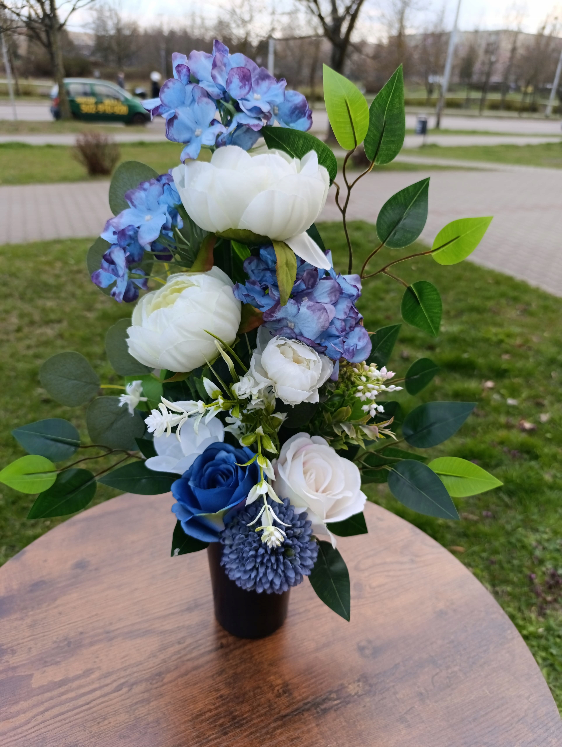 ✔ Композиція складається з, серед інших, квітів: гортензії, півонії, часнику та троянди та додаткові добавки у вигляді листя Фітонії, Гіпсауки або Евкаліпта . Стабільний на надгробному камені або вазі.