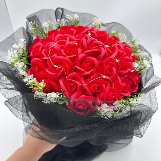 Букет Okazeo® з 33 червоних троянд з мильних пелюсток - це розкішна прикраса з винятковою глибиною кольорів. Кожна квітка має внутрішнє наповнення з пінополістиролу, що надає об’єм і забезпечує довговічність. Букет був оздоблений чорним тюлем та елегантним папером, що створює контрастний ефект та підкреслює інтенсивний колір троянд. Світлодіодне підсвічування м’яко підкреслює кожну пелюстку, створюючи романтичний та атмосферний ефект. Світлодіод працює від батарейок (входять в комплект) - букет готовий до виставлення після розпакування. Завдяки увазі до деталей і високій якості виготовлення, це елегантний елемент декору та унікальний подарунок.