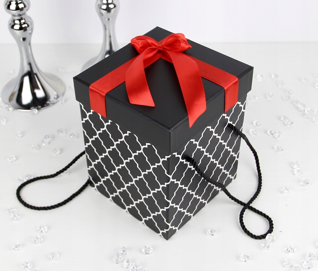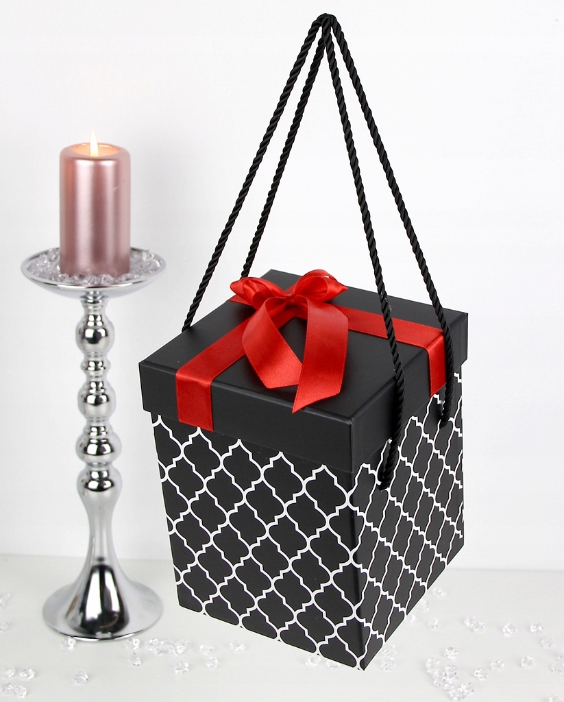 Коробка із середньої серії - розмір S відповідно наші позначки. Форма коробки - класичний кубовид на квадратній основі. Основний колір — чорний із принтом білого візерунка марокканської конюшини — елегантний і позачасовий візерунок.