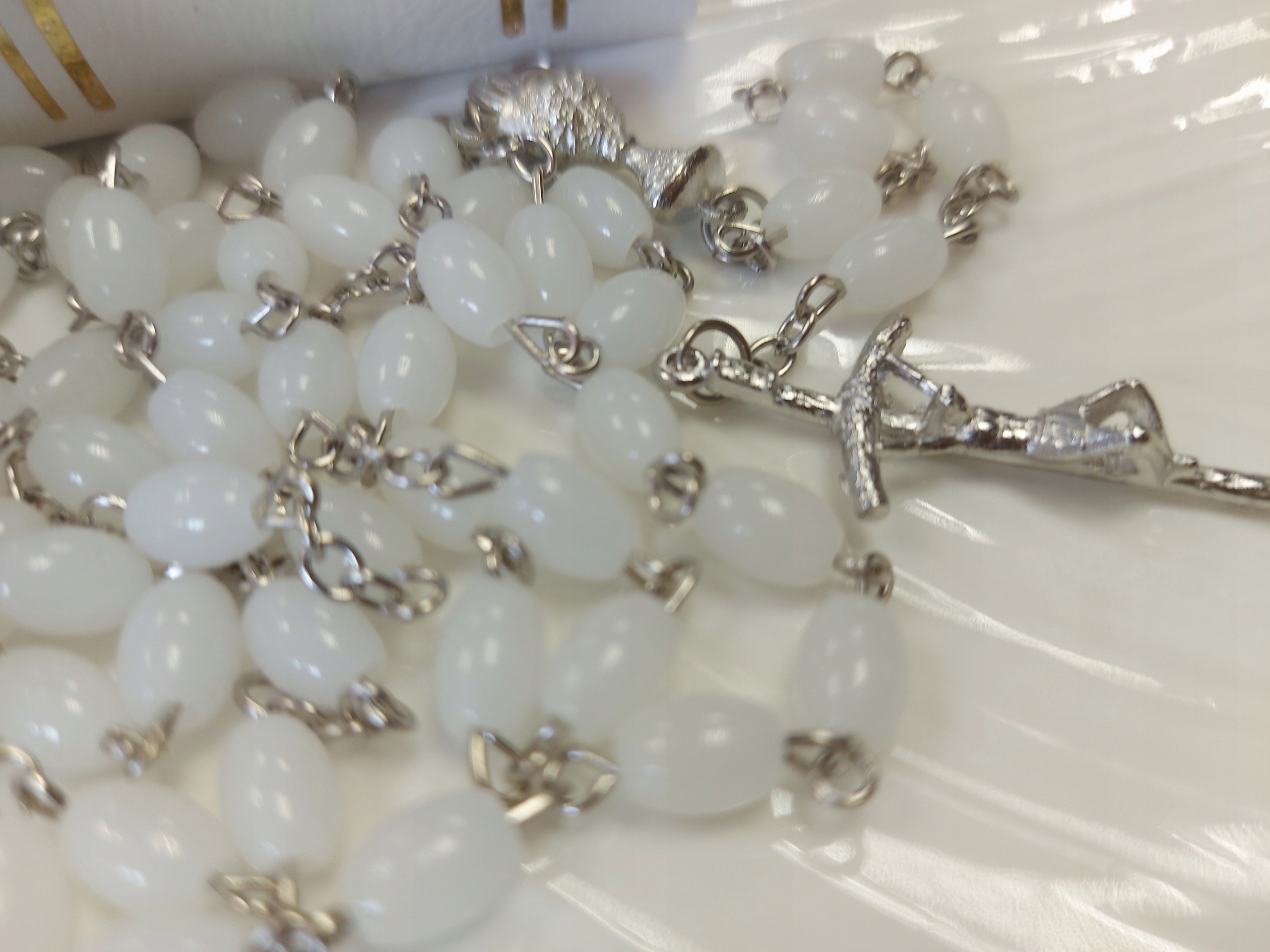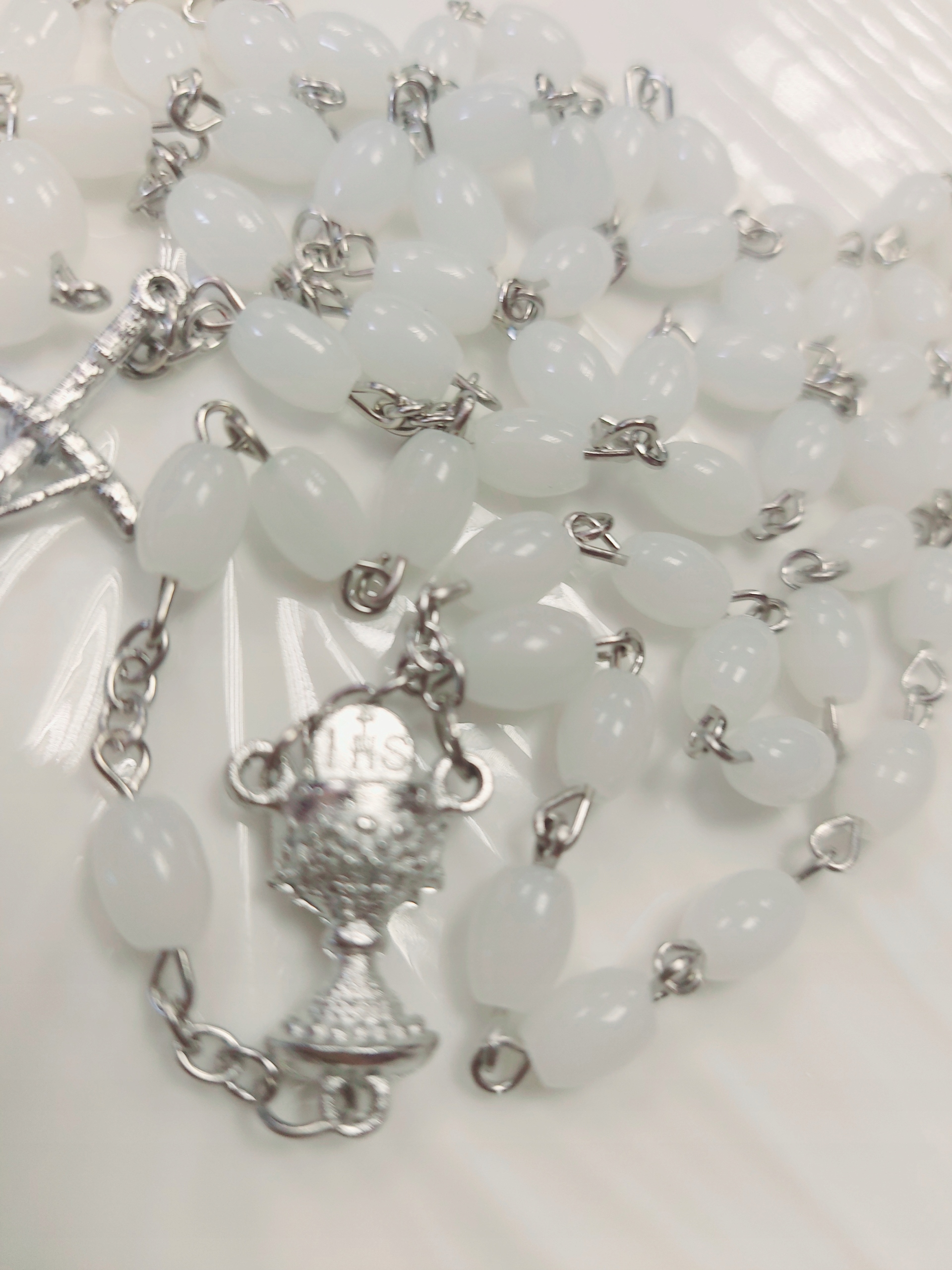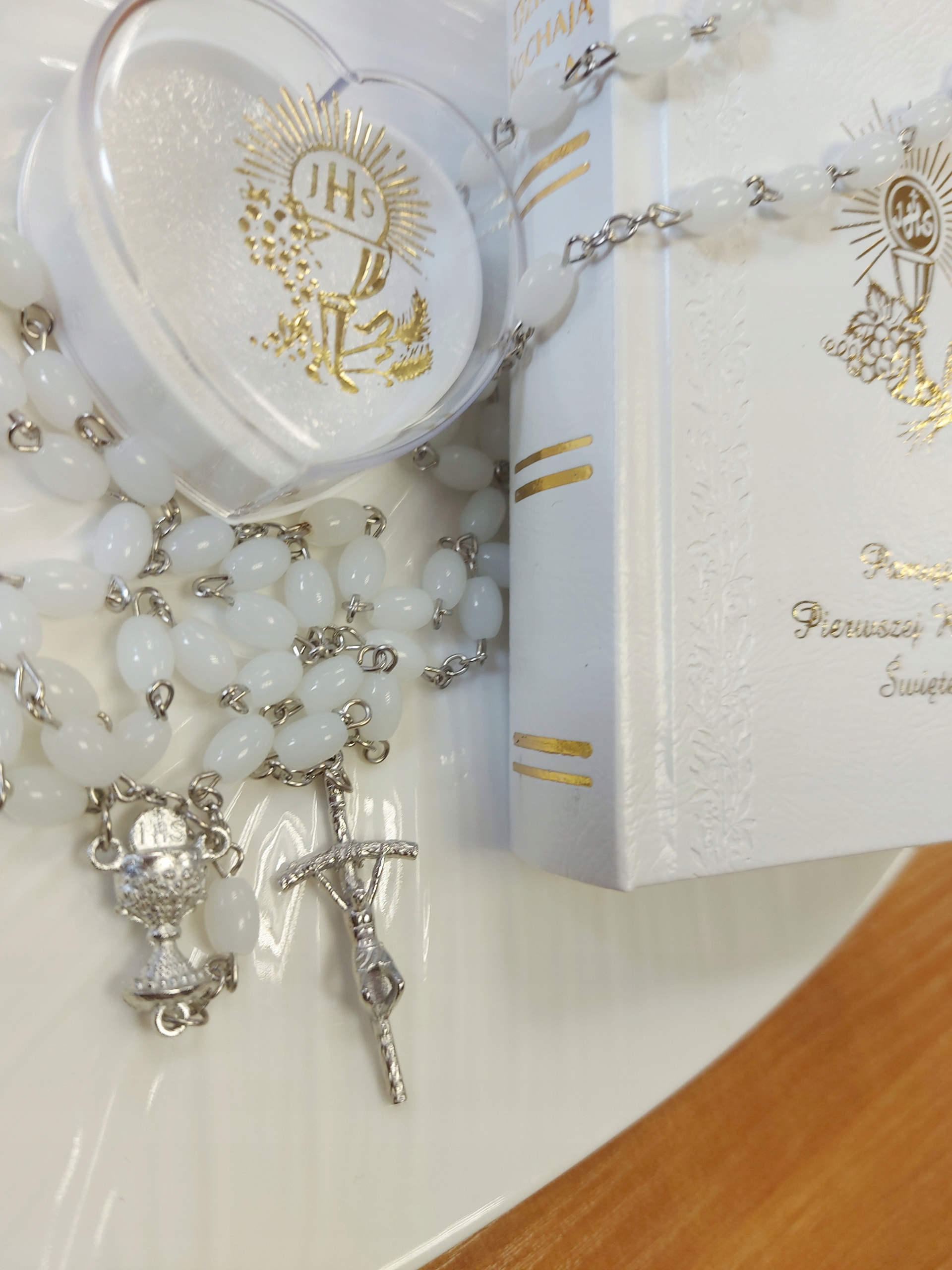 Вервиця для Першого Причастя, біла, овальна. форма + коробка, пластиковий футляр вервиця у формі серця