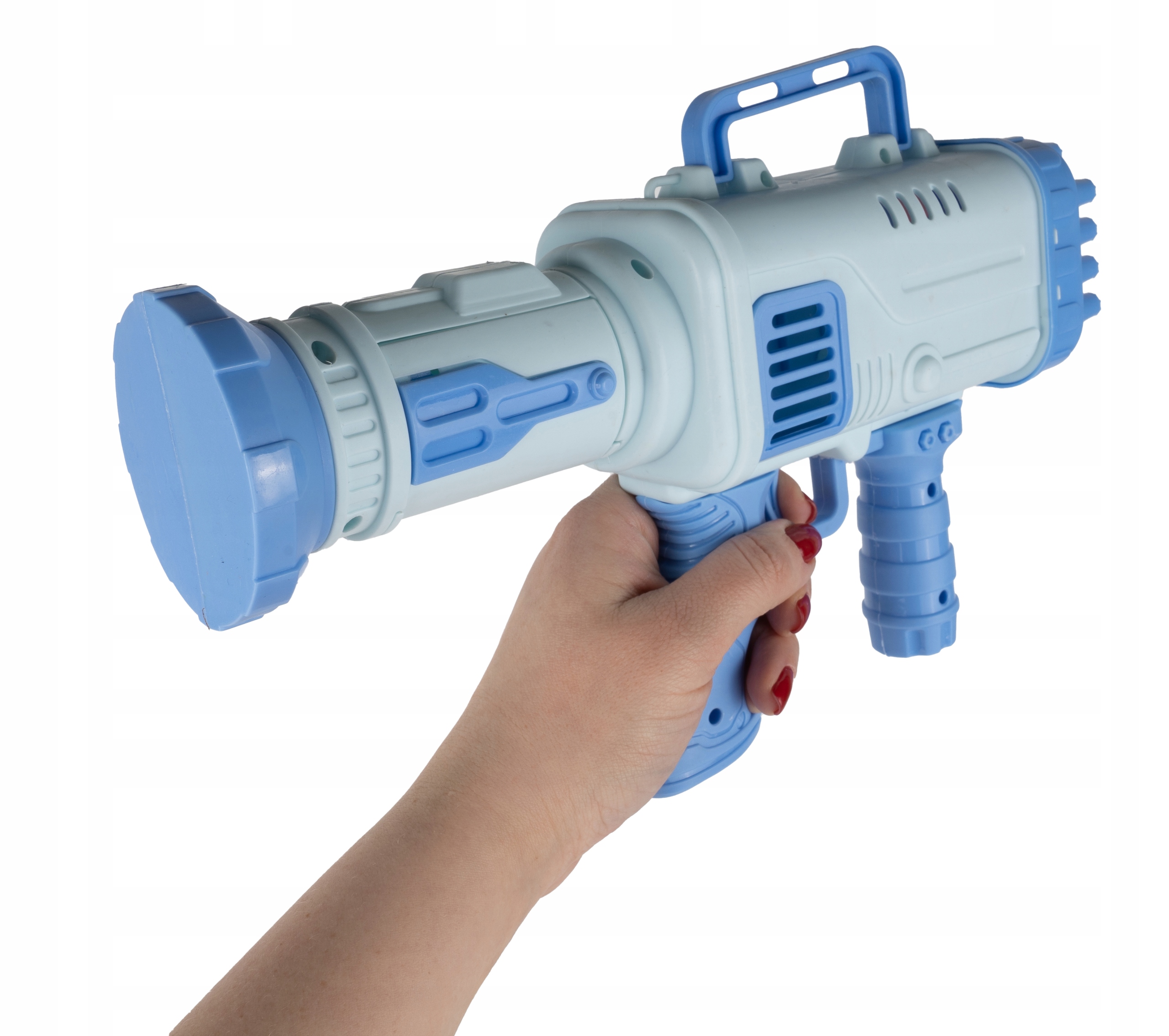 Налийте рідину в контейнер, що входить до комплекту, а потім занурте в неї отвори на передній частині пістолета. Натисніть на курок базуки і все! З цього моменту ви можете насолоджуватися видом красивих райдужних бульбашок, що ширяють у повітрі, виходячи з 32 отворів одночасно!