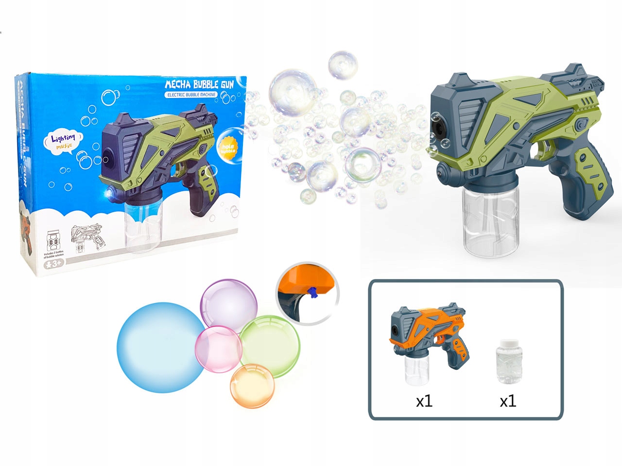 Чудовий пістолет для мильних бульбашок, який випускає багато справжніх бульбашок, коли ви натискаєте на курок. Просто прикрутіть пляшку з рідиною, натисніть на спусковий гачок і тисячі бульбашок вилетять з рушниці. Шоу райдужних бульбашок супроводжується світловими ефектами. На задній частині пістолета є кнопка, за допомогою якої можна вмикати або вимикати звукові ефекти. Чудова іграшка для дівчаток і хлопчиків навесні і влітку.