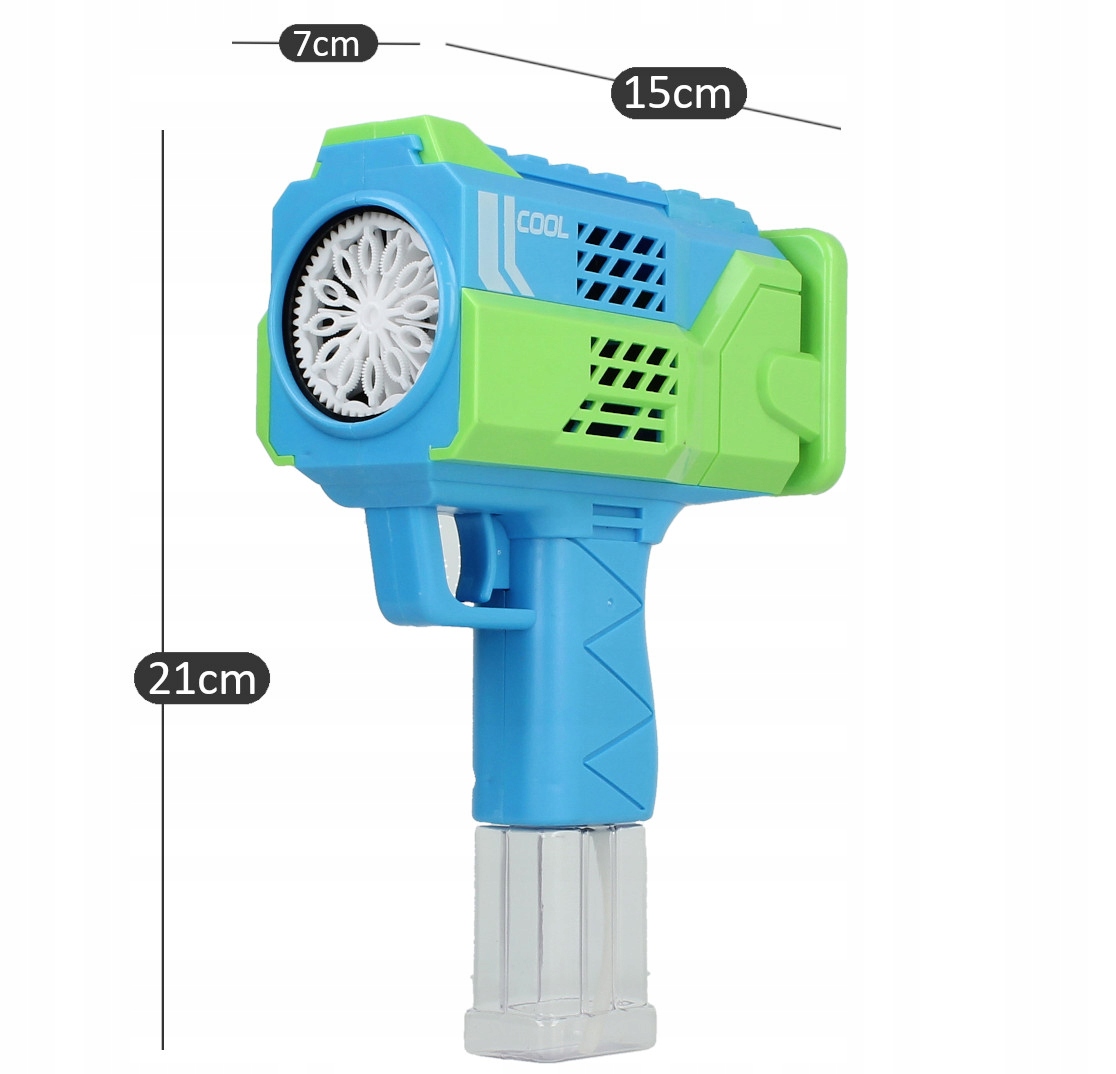 Ефективний генератор мильних бульбашок з вітряком може продути сотні мильних бульбашок за кілька моментів. Стильна і модна форма пістолета сподобається кожному коханню на свіжому повітрі!
