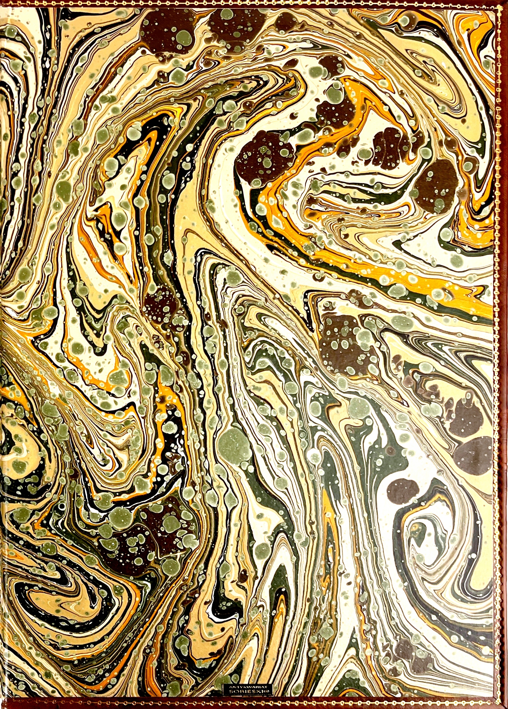 ТВЕРДА ОБКЛЮЧКА, ПОВНІСТЬ ШКІРИ, СУЧАСНИЙ. ОБКЛАДКА НАВОКРУГ З МОДЕЛЬНОЮ СЛІПОЮ РЕЛЬЄФНОЮ РАМКОЮ. СПИНКА З ОПУКЛИМИ ПАЛІТУРАМИ, ГЛИБОКИМ ТИСНЕННЯМ, ПРИКРАСАМИ ТА ПОЗОЛОЧЕННЯМ. ФАЙЛИ З МАРМОРИЗОВАНОГО ПАПЕРУ ВРУЧНОГО ФАРБУВАННЯ, ФАРБОВИ КАРТОК З МАРМУРОМ З ОДНАКОВИМ ВІЗЕРУНКОМ.