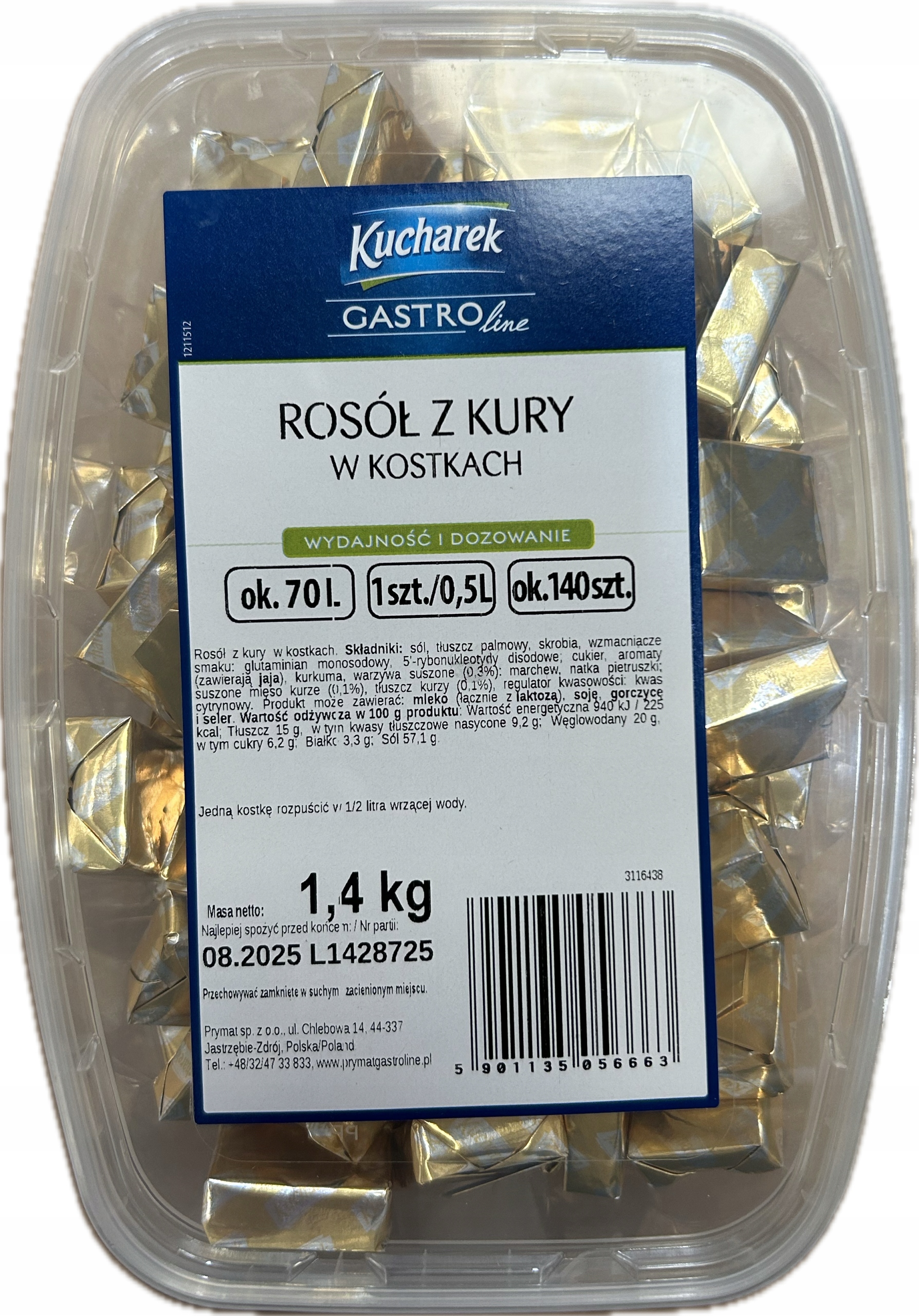 Виразний, золотистий курячий бульйон у кубиках від Kucharek GastroLine – це суть смаку м’яса птиці та овочевого бульйону. Це найпопулярніший бульйон у польській кухні, який часто використовують у ресторанах для приготування бульйону, овочевих супів, соусів, гуляшу та печені.