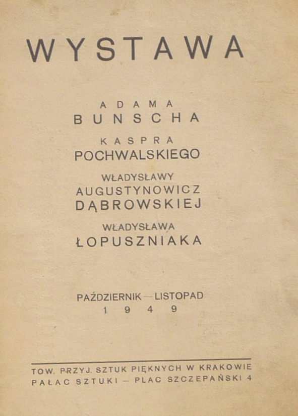 Каталог виставки Адама Бунша (57), Каспера Похвальського (49), Владислави Августинович-Домбровської (42), Владислава Лопушняка (10). Товариство Приятелів Красного Мистецтва в Кракові - Палац Мистецтв, жовтень-листопад 1949 р. Тираж 300 примірників, 8 сторінок, розмір 14х20 см, стан добрий [всього - список 168 робіт, кількість виставлених робіт. окремих авторів подано в дужках] [ СУЧАСНЕ МИСТЕЦТВО ПОЛЬЩИ ][ КАТАЛОГ ] 7321