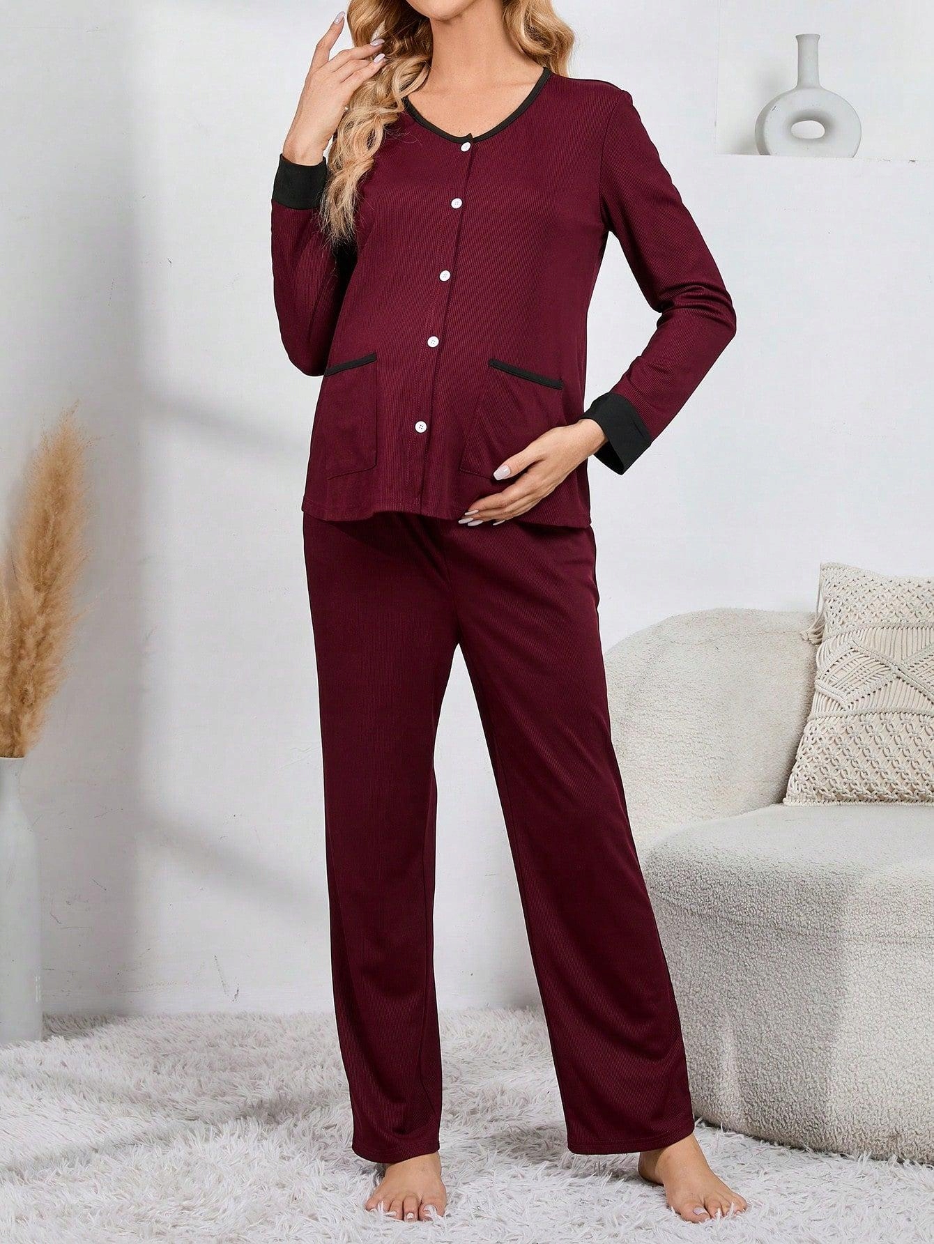 Бургундська смугаста піжама встановлює кнопки блузки кишені штани Shein XL