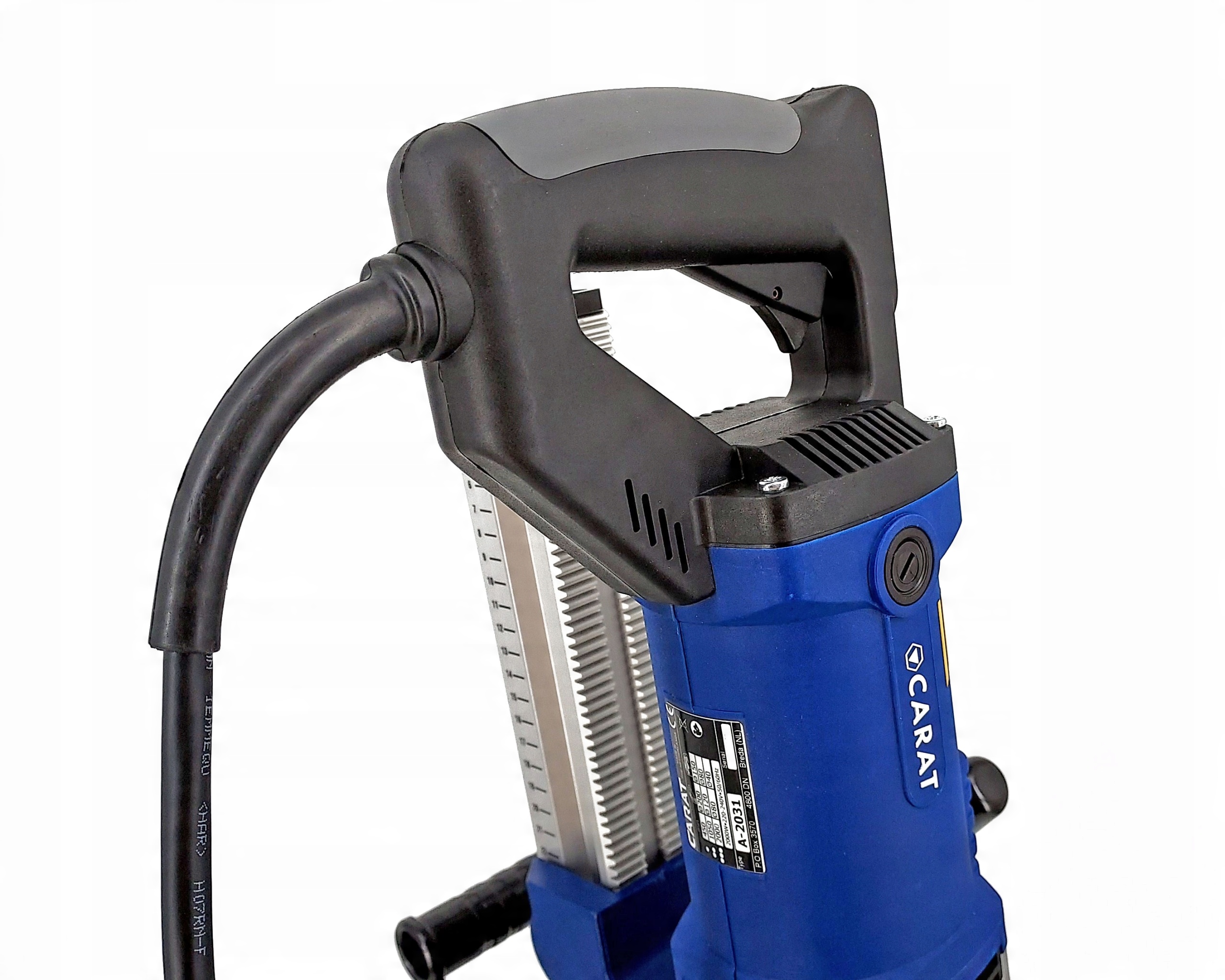 - Задня робоча рукоятка, що дозволяє свердлити вручну, оснащена рівнем і індикатором перевантаження.
