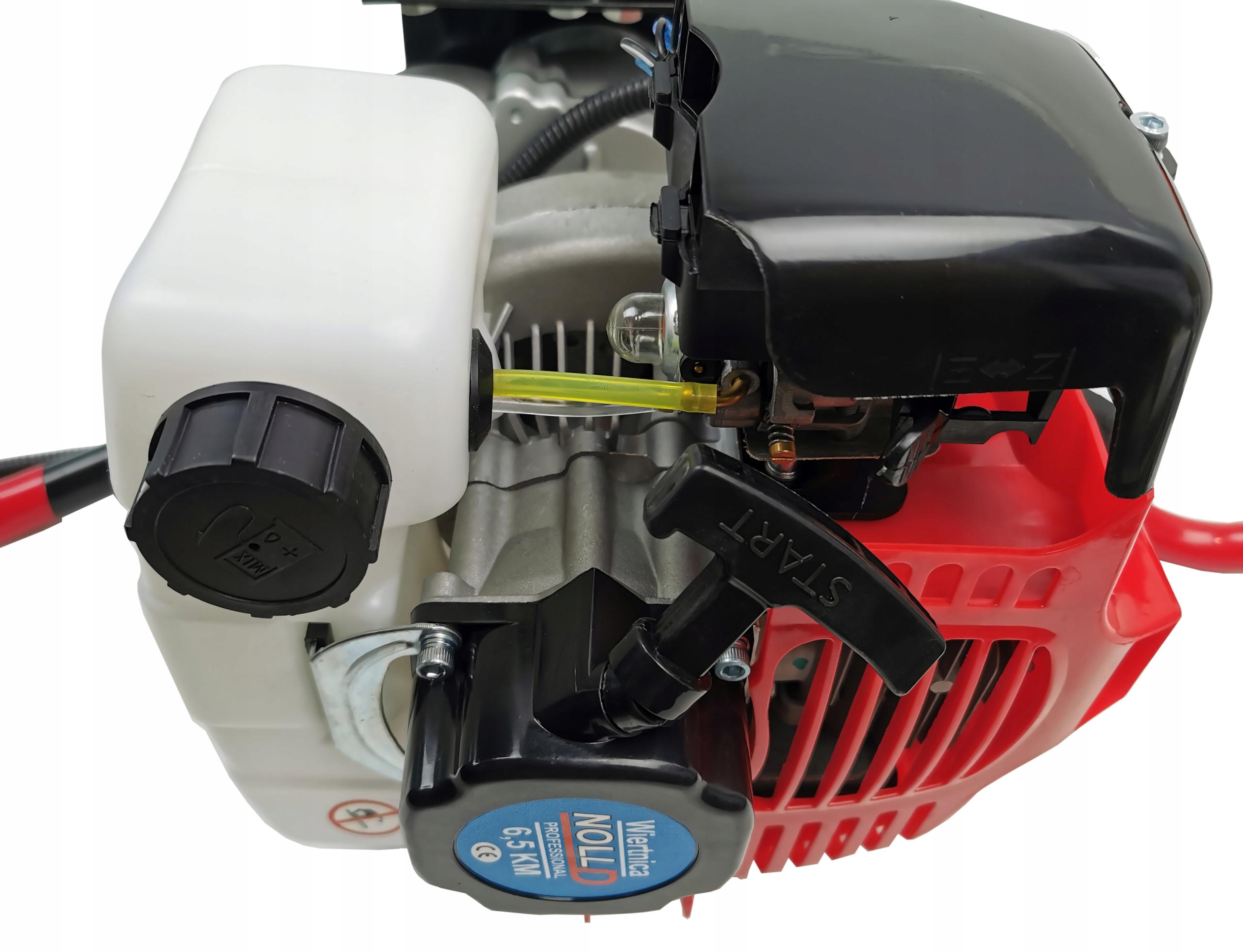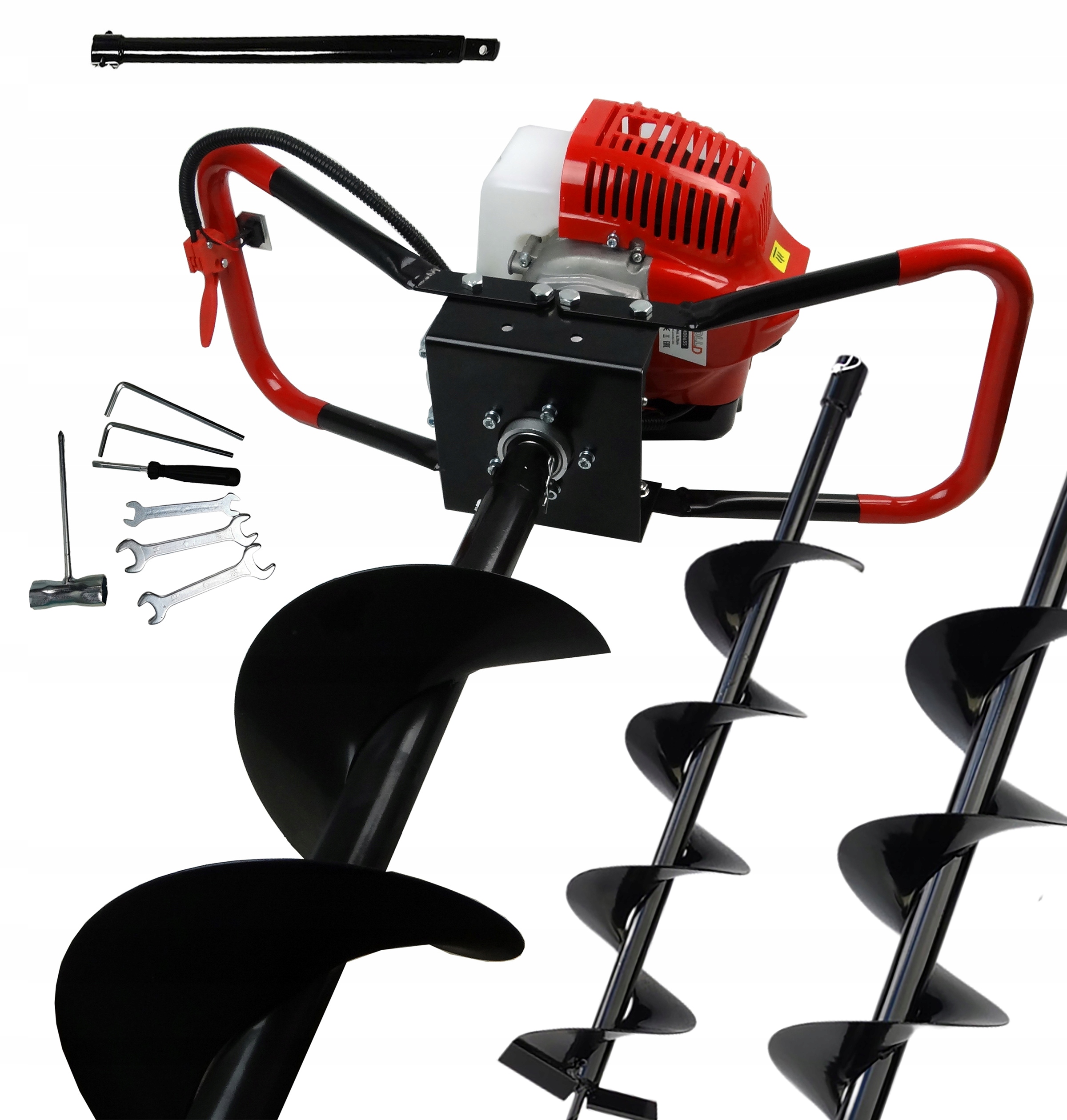 Рукоятки, покриті м'якою гумою, забезпечують більший комфорт роботи. Кельма на одну або дві особи. Ідеальне спорядження, добротне виконання. Бензинова бурова установка з міцним двигуном потужністю 6,5 к.с.