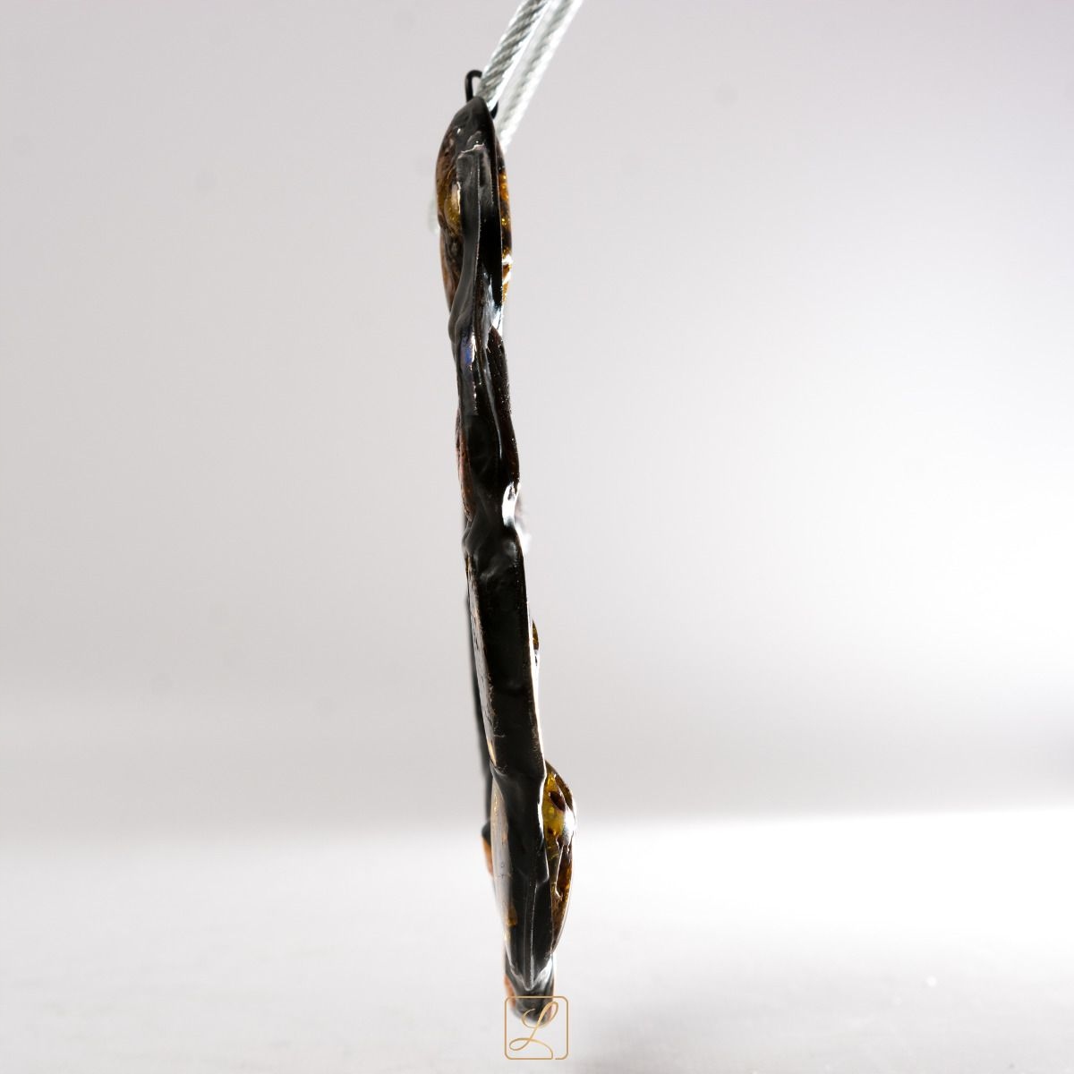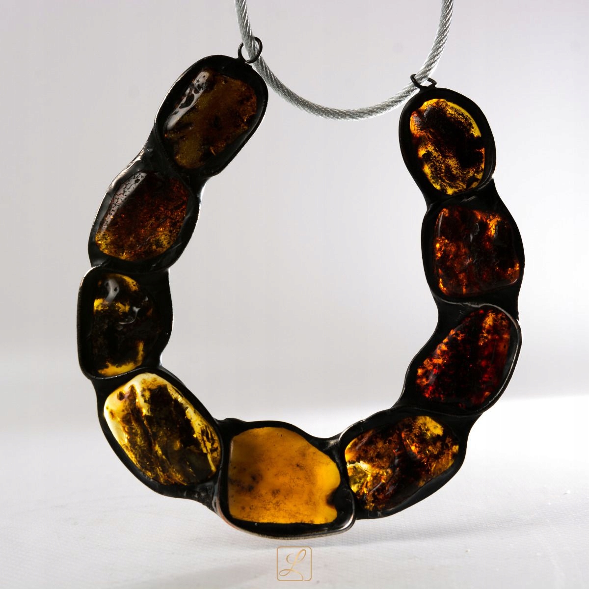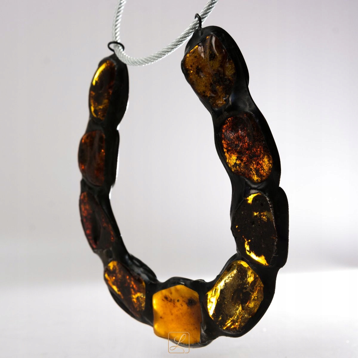 Підкова виготовлена методом художніх рукоділля. Використані шматочки балтійського бурштину підібрані за кольором, щоб показати всі відтінки цієї благородної сировини в найкрасивішому композиції. Кожен камінь обмотаний мідною стрічкою. Для ефекту навколо каменів намотують зігнуту вручну мідну дріт. Проміжки між камінням і дротом заповнені чорною патинованою жерстю. Камені використовуються дійсно великі, що вирішальним чином впливає на ціну виробу. Чим більше штук, тим вища ціна. Польський товар - підтримуємо польські ремесла.