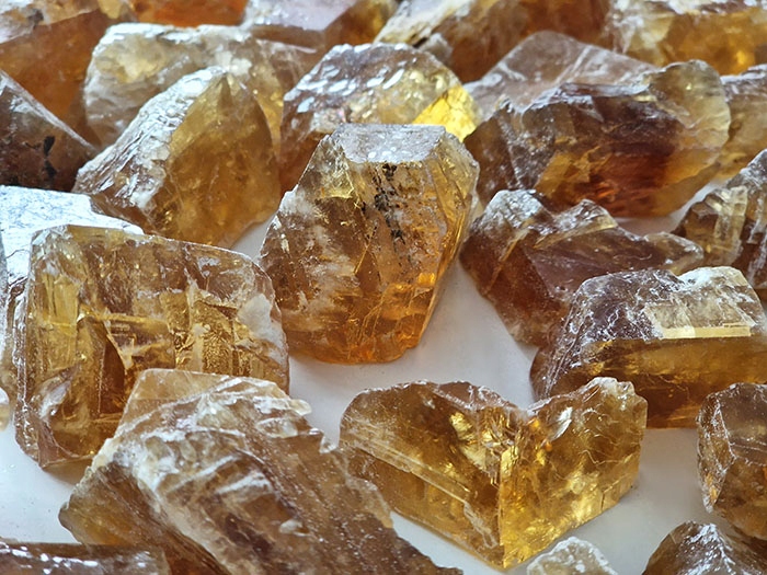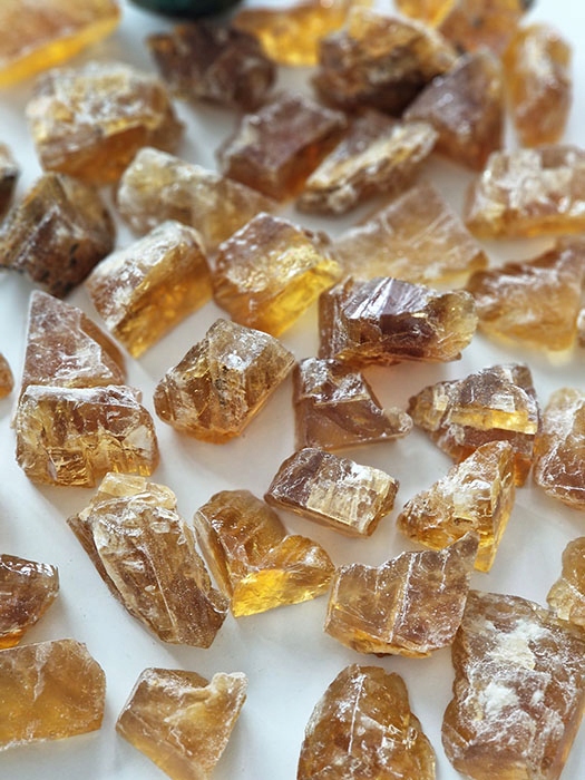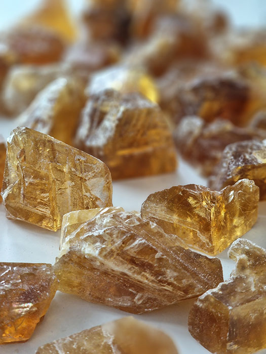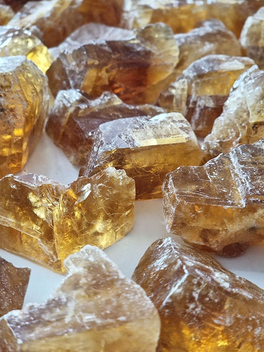 Бурштин кальцит має прекрасний золотистого кольору, що нагадує скам'янілу деревну смолу, від чого походить його назва.