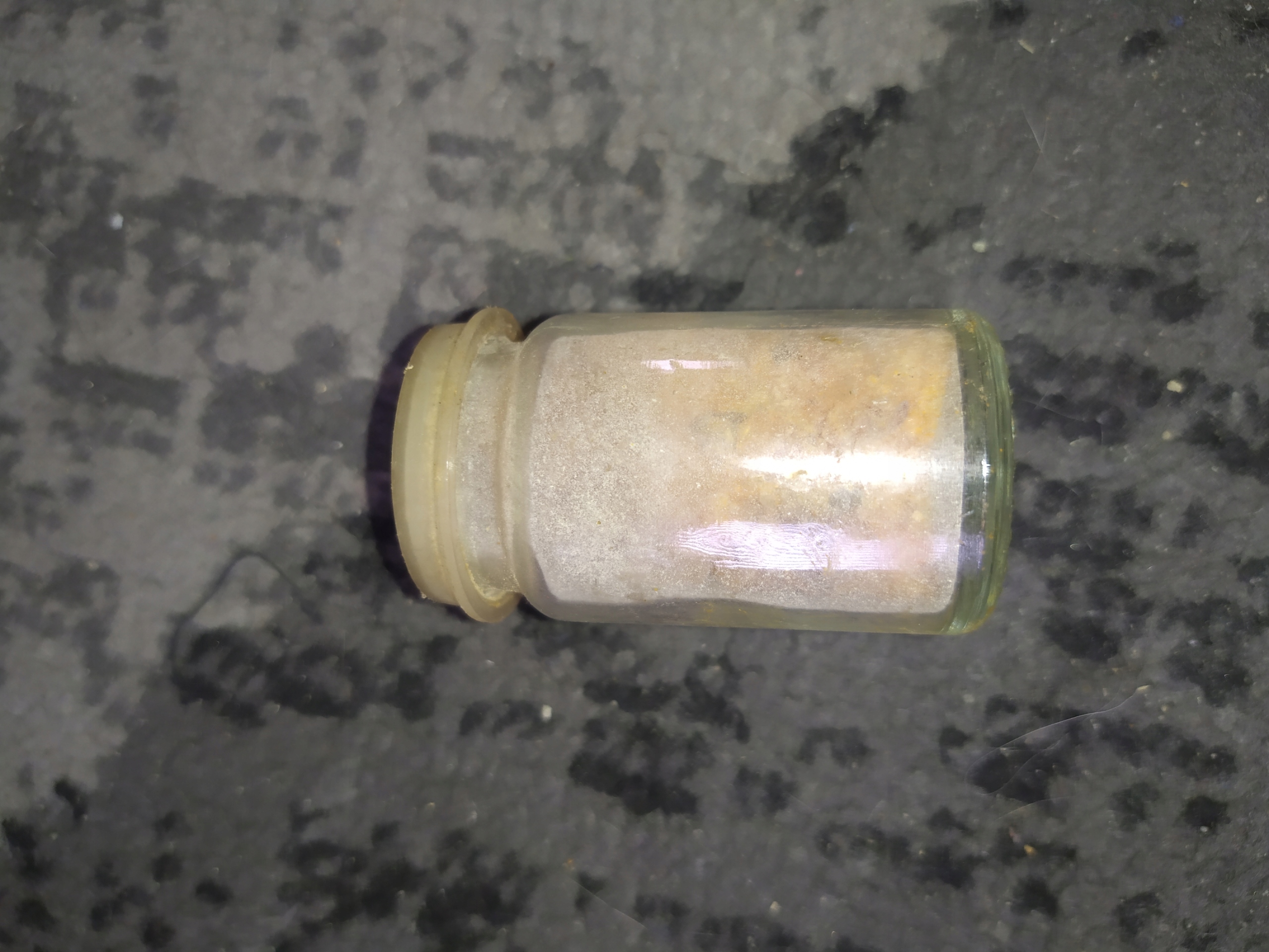 Невелика баночка бурштину, в основному дрібний пил, але є також маленькі камінці, приблизно 1-2 мм у діаметрі. Натуральний неогранений бурштин не підходить для ювелірних виробів, але з нього можна приготувати домашню настоянку або як ароматизатор для свічки. Монета на фото для порівняння розміру банки.