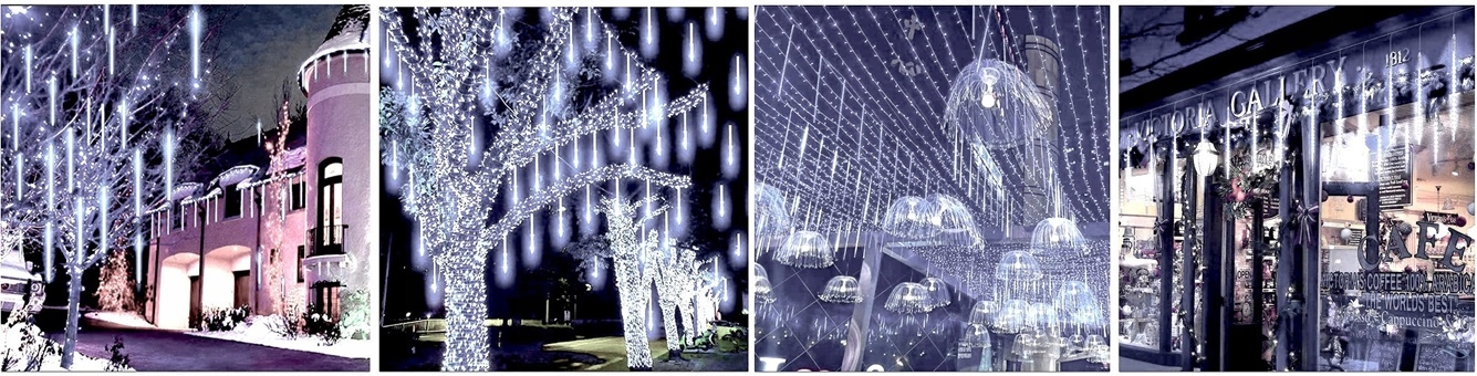 Наші світлодіодні метеоритні бурульки виглядають як справжні бурульки та сяють приємним холодним білим послідовним хвилеподібним світлом, що імітує капання.