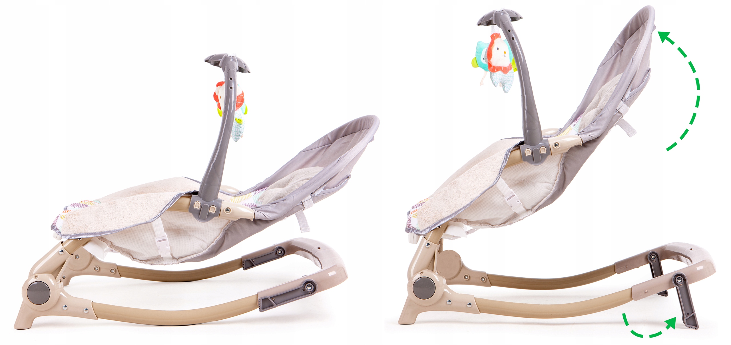 Достатньо двох рухів, щоб замок відкинувся, і качалка перетворюється на стійкий і зручний лежак або крісло. Коли малюк засне під час заколисування, ви можете скористатися варіантом лежака, завдяки якому малюк буде займати зручне положення для сну. Завдяки повному регулюванню сидіння, сидіння також підходить для годування