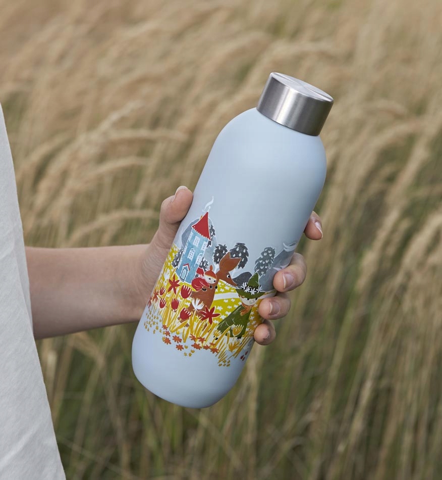 Пляшка виготовлена з нержавіючої сталі, нанесена на корпус і прикрашена графікою, яка зображує сцену з життя Мумі-тролів та їхніх друзів.