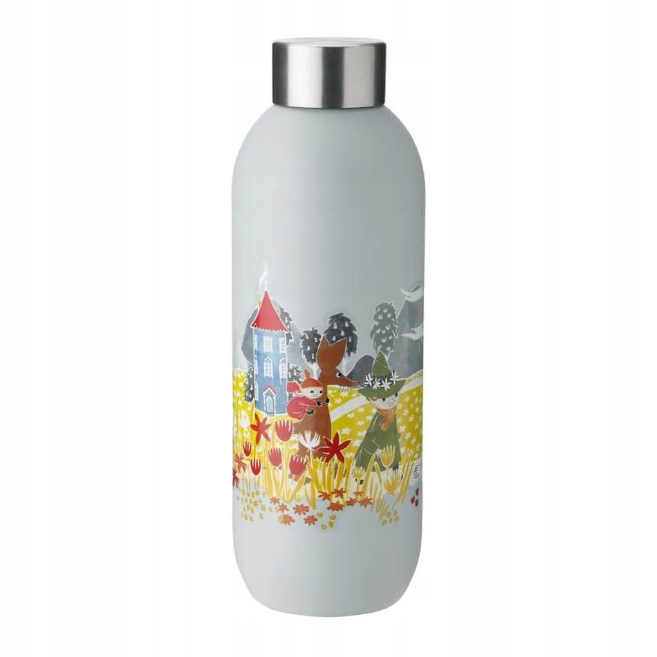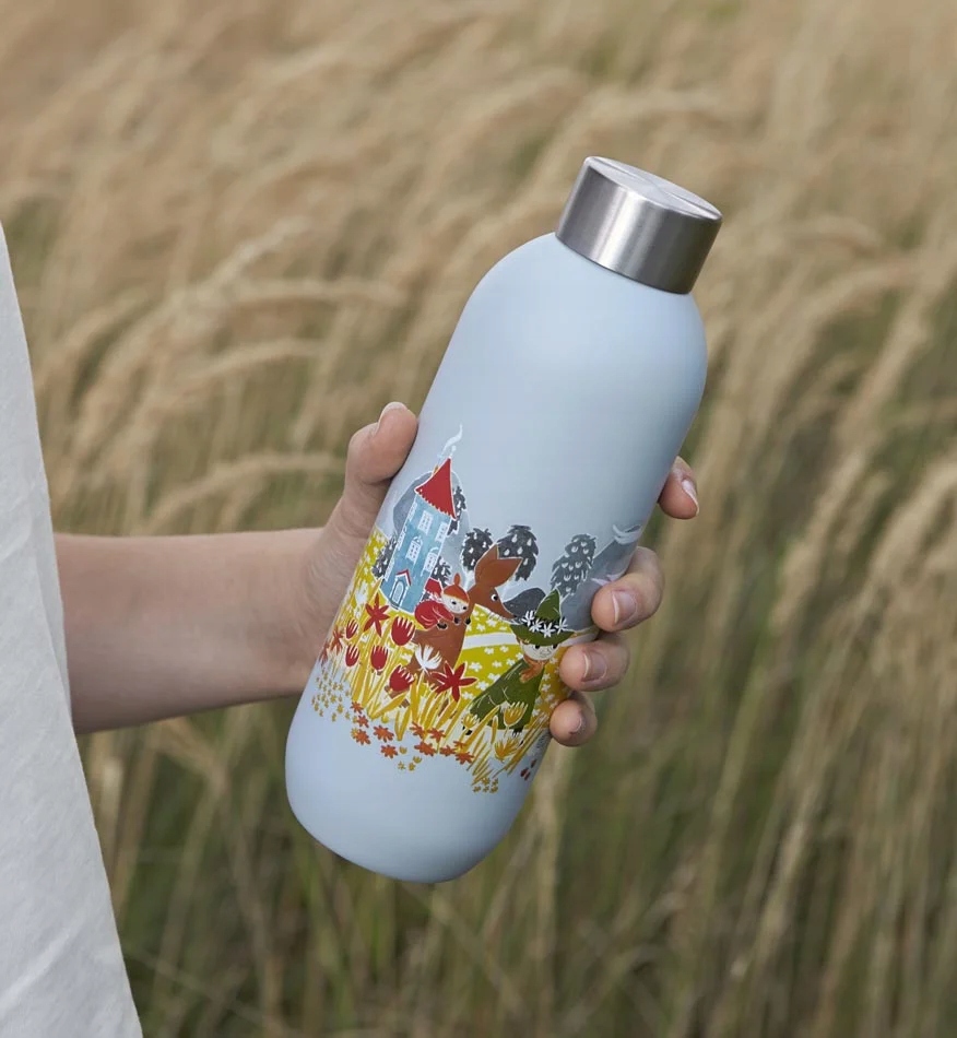 Пляшка виготовлена з нержавіючої сталі, нанесена на корпус і прикрашена графікою, що зображує сцену з життя Мумі-тролів та їхніх друзів.