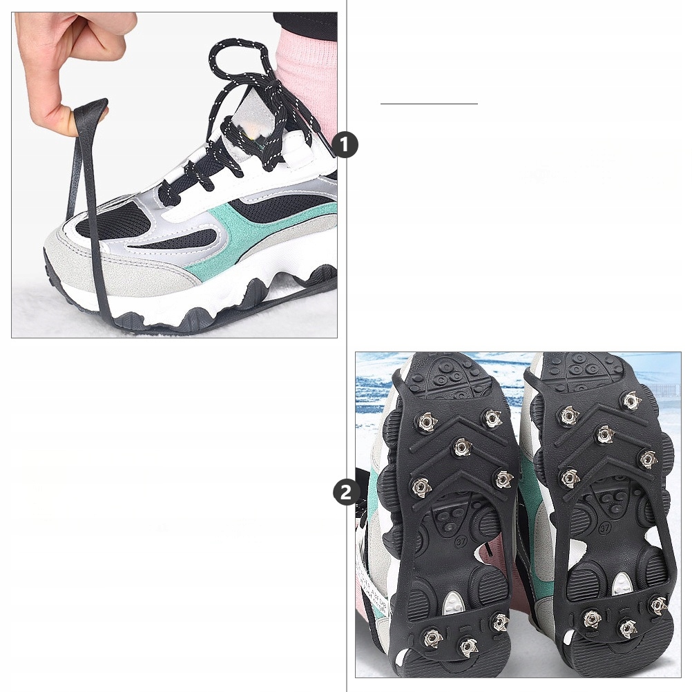 - Металеві протиковзкі зубці є високої твердості, що забезпечує надійне захоплення та запобігає їх падінню, що дозволяє багаторазове використання протягом тривалого періоду часу. Він легко справляється з крижаними, засніженими та брудними поверхнями.
