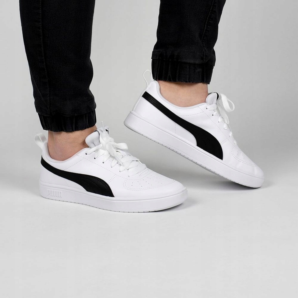 Puma Rickie JR — білі молодіжні черевики, доповнені чорними елементами, пов’язаними з брендом. Виготовлені з якісної екологічної шкіри. Гумова підошва гарантує зчеплення. Молодіжне взуття Puma Rickie JR призначене для щоденного використання.