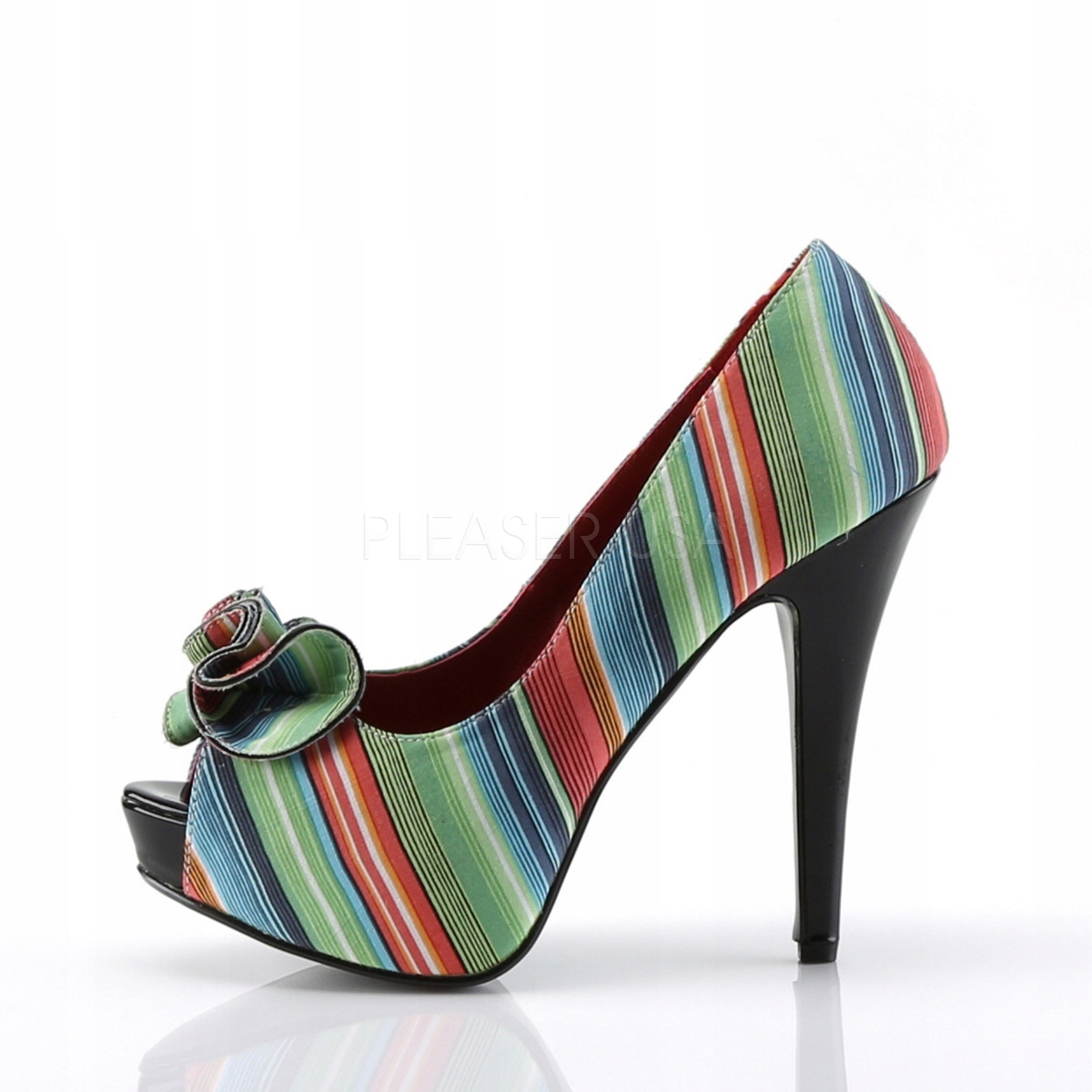 Чуттєві і в той же час дуже елегантні жіночі туфлі на підборах LOLITA-12 з різнокольоровими смужками. Дана модель взуття виготовлена з високоякісних матеріалів. Завдяки цьому високі підбори можуть носити і жінки, які відмовилися від використання виробів з натуральної шкіри. Каблуки висотою 12,7 см оптично струнять фігуру. Правильно спрофільована підошва гарантує комфорт і стабільність під час ходьби або інших видів діяльності. Виріз на носку відкриває жіночі пальці, що виглядає надзвичайно сексуально. Крім того, відводить зайву вологу від стопи. Також варто звернути особливу увагу на декоративний елемент у вигляді волана, завдяки якому ця модель взуття виглядає надзвичайно елегантно.