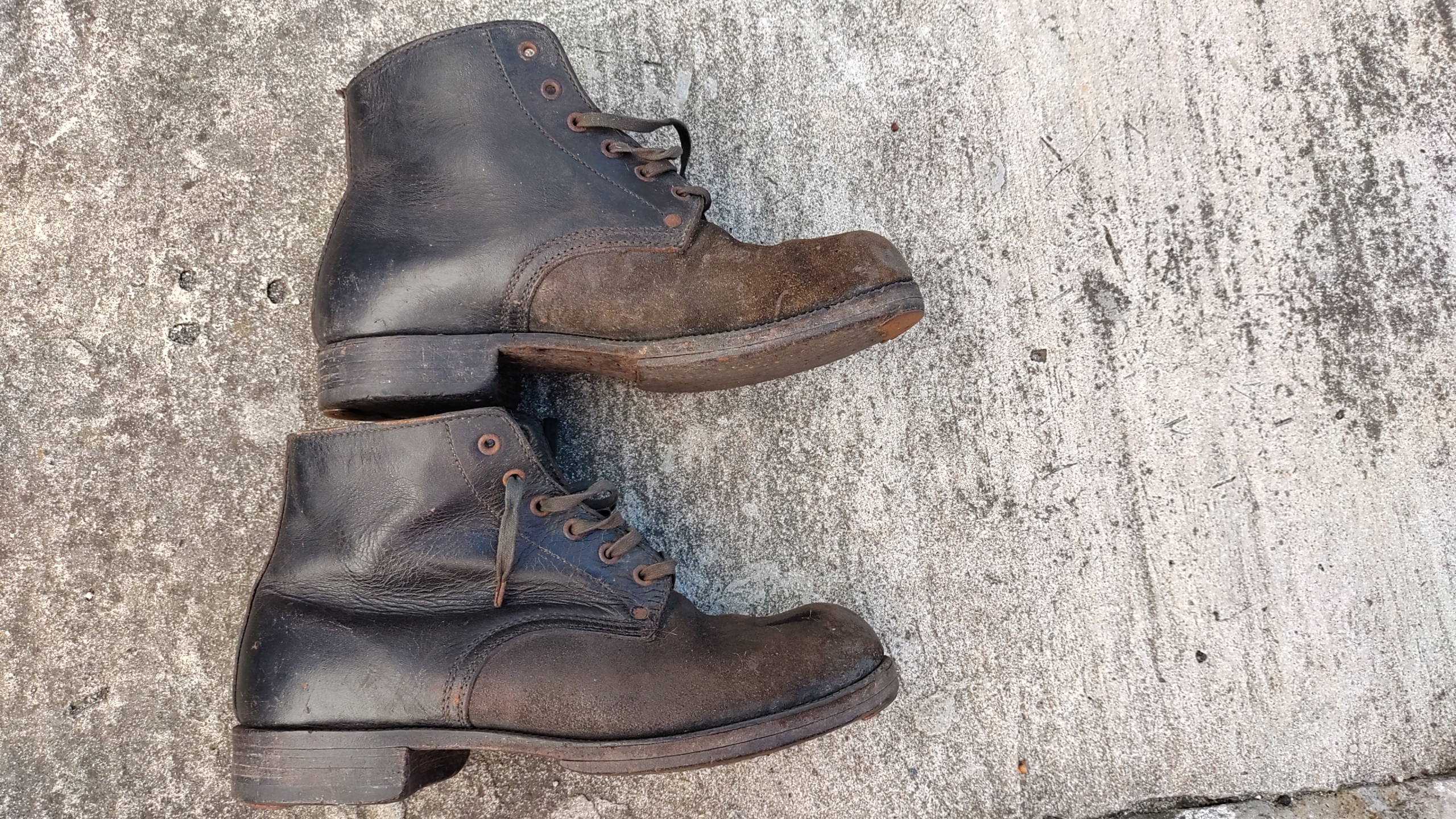 Черевики старі, досить жорстка шкіра. Але в цілому взуття тримається добре. В одного черевика немає язика. Мені важко сказати, скільки їм років.