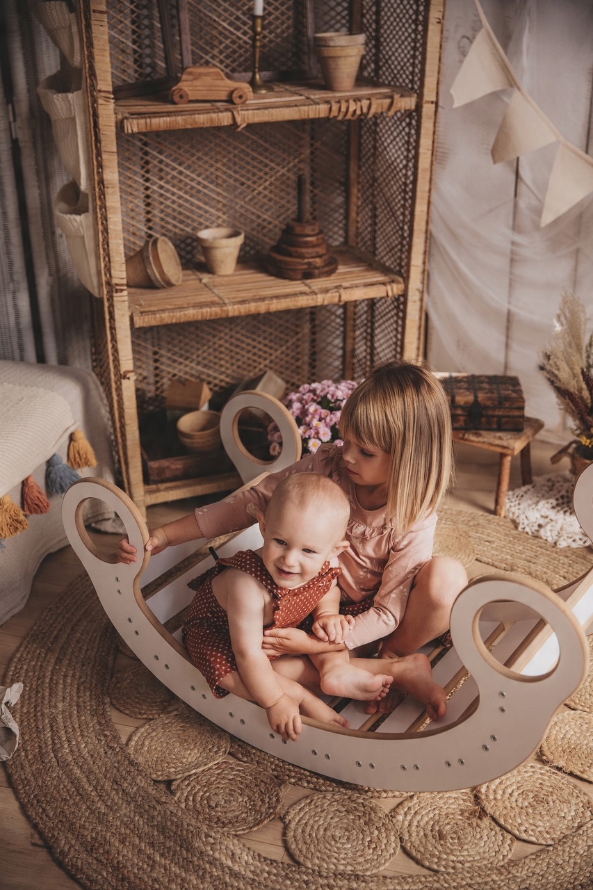 Ось Дерев'яна качалка Монтессорі, надзвичайна іграшка для дітей, яка стимулює їх уяву та розвиває різноманітні уміння. Цю інноваційну гойдалку можна використовувати в двох варіантах: як класичну гойдалку або як міст. Його застосування обмежене лише дитячою творчістю.