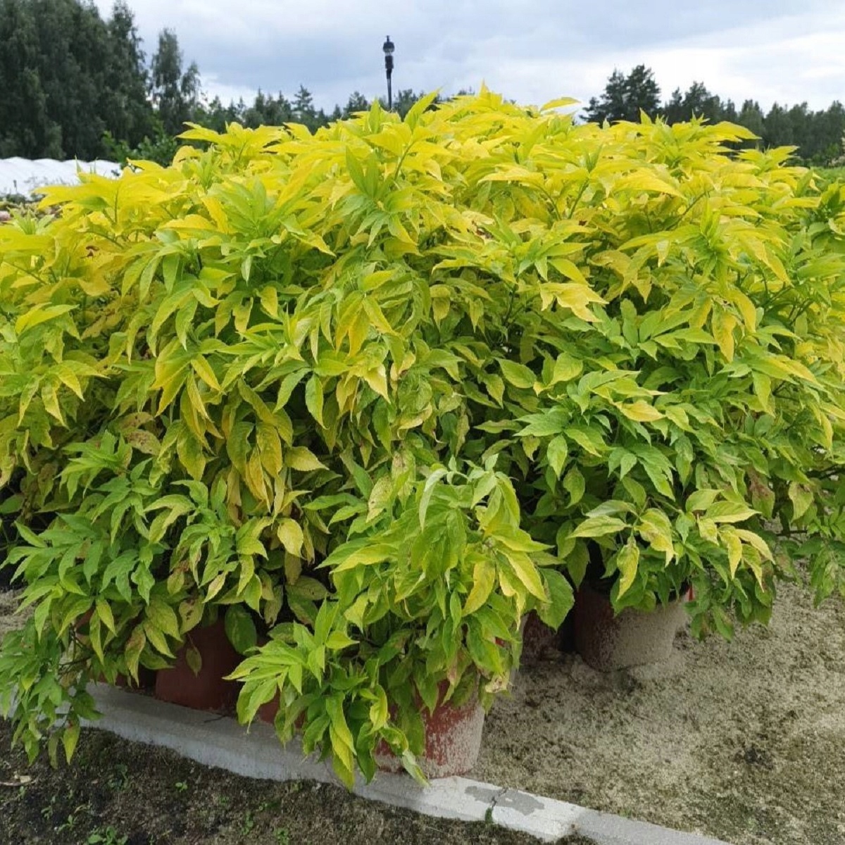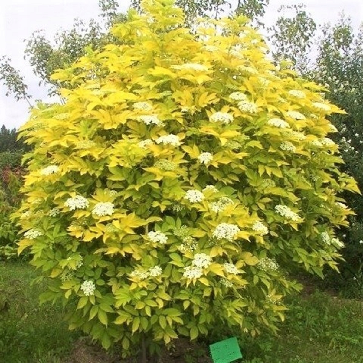 Привабливий кущ із золотистим листям. Великий прямостоячий кущ або іноді невелике низькоросле дерево з округлою куполоподібною кроною і звисаючими гілками. Досягає до 3 м у висоту. Стебла товсті, світло-сірі, часто дугоподібні. Стара кора сіра, з глибокими борознами, пробкова. Листки складні, до 30 см завдовжки, молоді інтенсивно-жовті, старші жовто-зелені, складаються з 5-7 листочків яйцеподібної форми, до 10 см завдовжки, гострокінцеві, з зубчастими краями. Вони сходять рано навесні і довго тримаються на кущі восени. При подрібненні вони виділяють характерний різкий запах. Квітки дрібні, крейдяно-білі, зібрані в дископодібні парасольки діаметром 10-20 см, з різким запахом, охоче відвідуються метеликами. Цвіте з травня по липень. Плід дрібний, кулястий, стиглий - блискучий, темно-синьо-чорний, дуже соковитий. Містять вітаміни А, В і С, багато засвоюваного цукру і калію, їх використовують для консервації і як добавку до страв. Невибагливий кущ, стійкий до посухи та міських і промислових забруднень. Повністю морозостійкий. Віддає перевагу родючим, гумусним і вологим ґрунтам з високим вмістом азоту і кальцію, але також росте на піщаних і сухих ґрунтах, хоча трохи гірше. Вимагає сонячного або злегка затіненого місця. Сонце може трохи обпалити листя, але в тіні листя зеленіє. Чагарник для посадки в парках, громадських зелених зонах і великих садах. Це створює цікавий колірний ефект в композиції. Його можна використовувати для посадки дерев на пустирі.