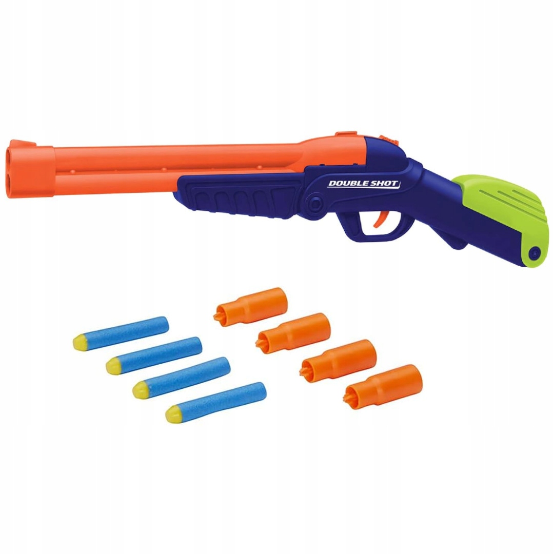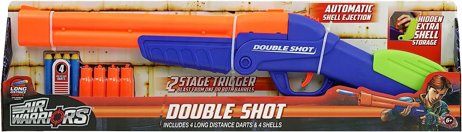 Подвійний постріл Air Warriors нагадує культову рушницю. Довгий подвійний ствол є однією з основних особливостей нашої рушниці. Рушниця відрізняється способом заряджання патронами — щоб її зарядити, ми повинні зігнути ствол, перемістивши кнопку, яка дозволяє його розблокувати, і зарядити дві патронники спеціальними гільзами, які ми попередньо наповнили дротиками. Тепер нам залишилося знову з'єднати ствол з рукояткою і зробити постріл, натиснувши на спусковий гачок. Щоразу, коли ви натискаєте на спусковий гачок, лунає ще один постріл. Однак, якщо ми хочемо зробити подвійний постріл, ми повинні натиснути на спусковий гачок сильніше і до упору. Ще одна цікава річ у використанні дробовика – це перезарядка. Ми продовжуємо, як і першого разу, за винятком того, що нам потрібно бути обережними, тому що гільзи, що залишилися в патронниках, буквально випадають, коли їх відкривають.