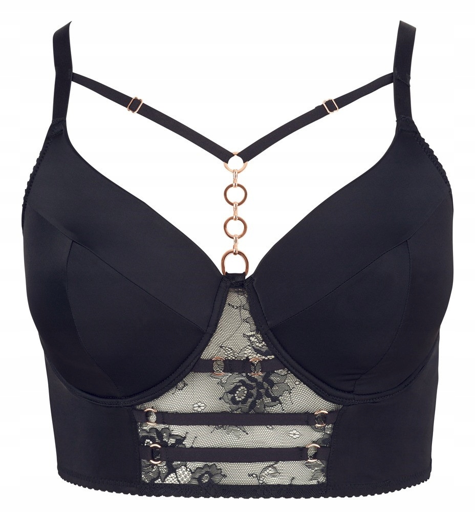 Лонглайн бюстгальтер з злегка жорсткими мисками на підвісках. Бюстгальські ремінці можна регулювати індивідуально для ідеального пристосування. Чорний, з красивими деталями рожевого золота. Еластичний, непрозорий матеріал.