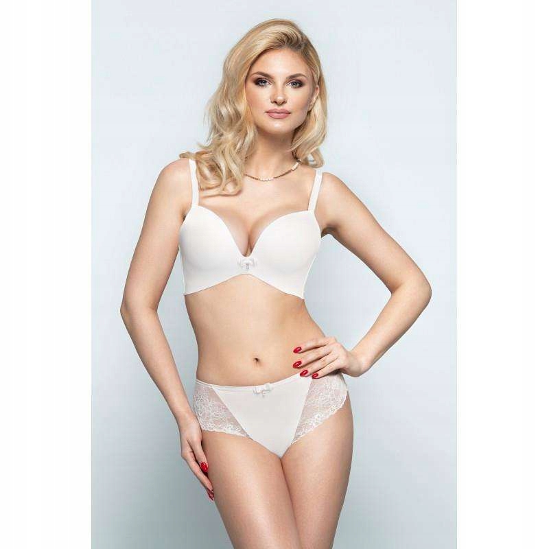 Гладкі термоформовані чашки з інтегрованим наповненням push-up. Бічні сторони та задня частина лямок виконана з ніжного мережива. Окружна стрічка оснащена боковою зміцнювальною панеллю у вигляді пластикової кісточки. Бретелі спереду відстібаються. Можливість перехрещування лямок на спині.