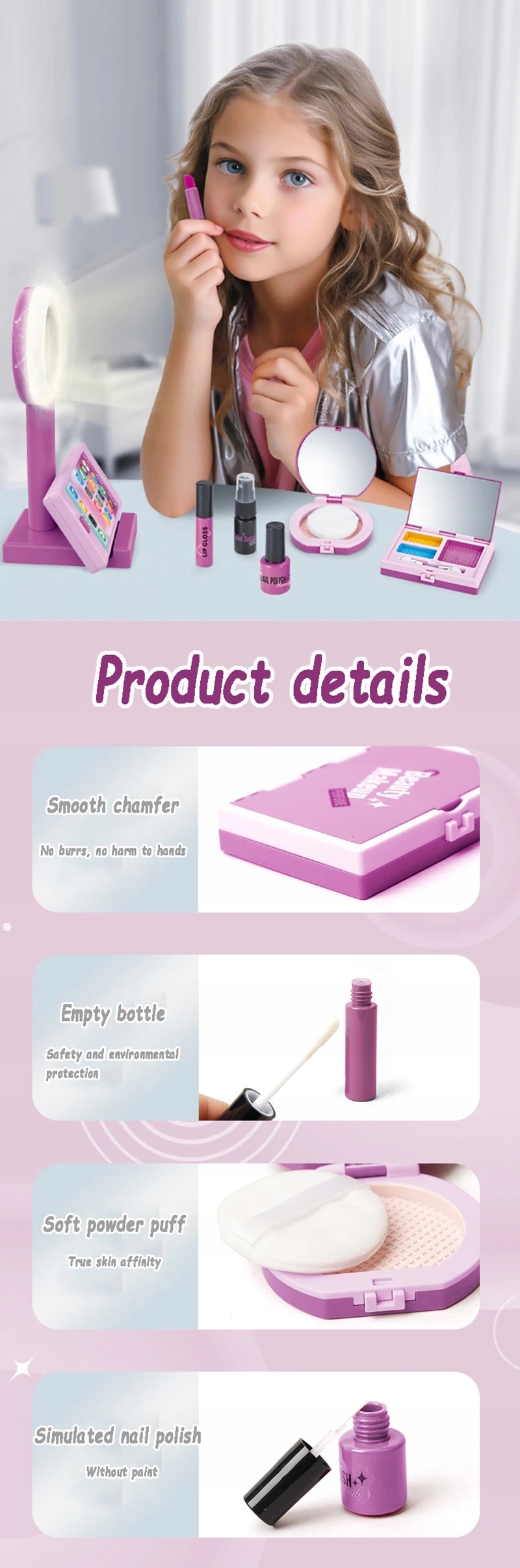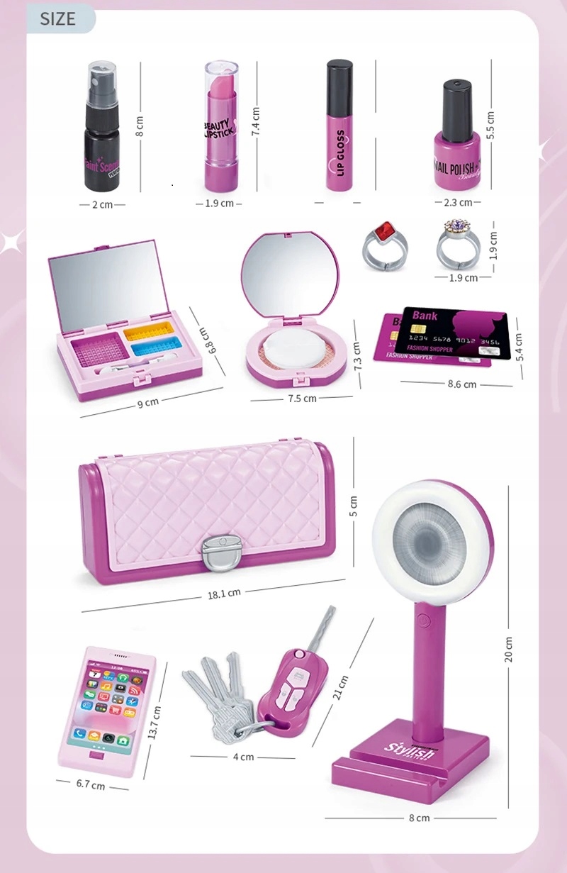 Набір для дівчат, які люблять грати з макіяжем. У набір входять тіні, пудра, помада, настільна лампа з підсвіткою для макіяжу. Світильник працює від батарейок 2хААА. Батарейки в комплект іграшки не входять. Набір призначений для дітей від 3 років. Продукт упакований в картонну коробку з прозорим віконцем. Наведені розміри є розмірами упаковки.