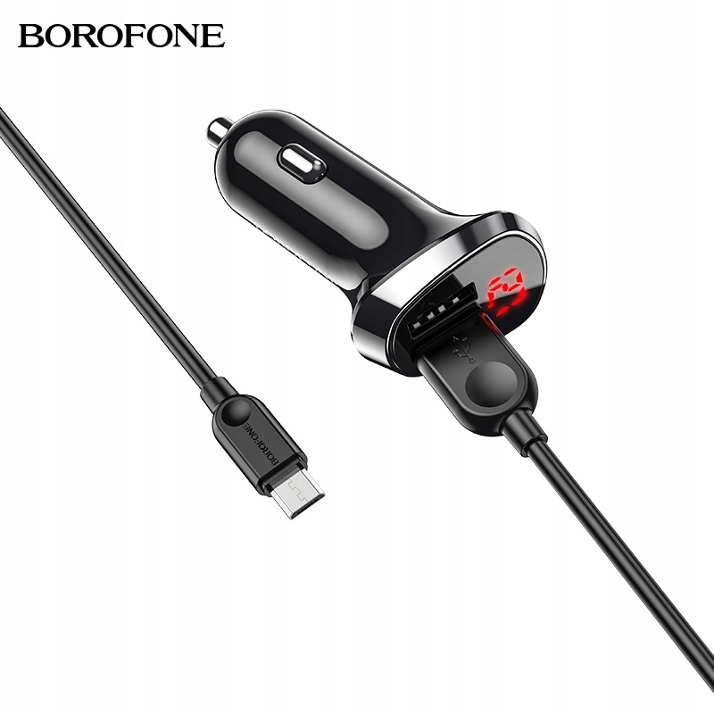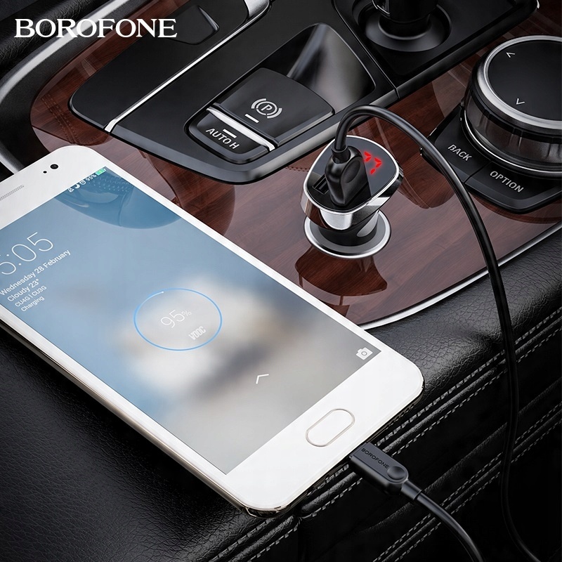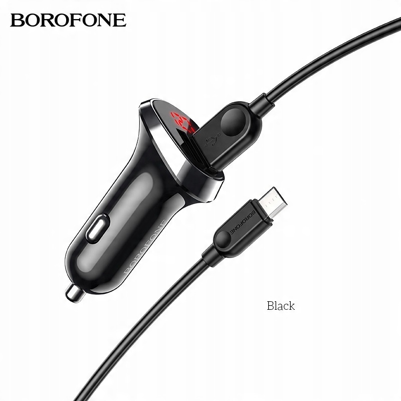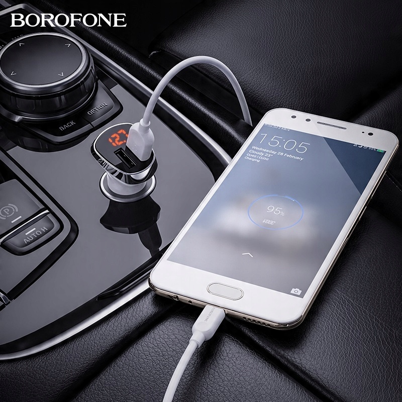 BOROFONE BZ15 Auspicious – це автомобільний зарядний пристрій із двома USB-портами потужністю 2,4 А кожен, загальна потужність максимум 2,4 А, додатково оснащений світлодіодним дисплеєм, який показує стан акумулятора автомобіля на стоянці та після запуску двигуна, силу струму та ампер під час зарядки мобільного пристрою, а також кабель micro USB 1M, призначений для зарядки мобільних пристроїв з Android та інші, обладнані таким роз’ємом.