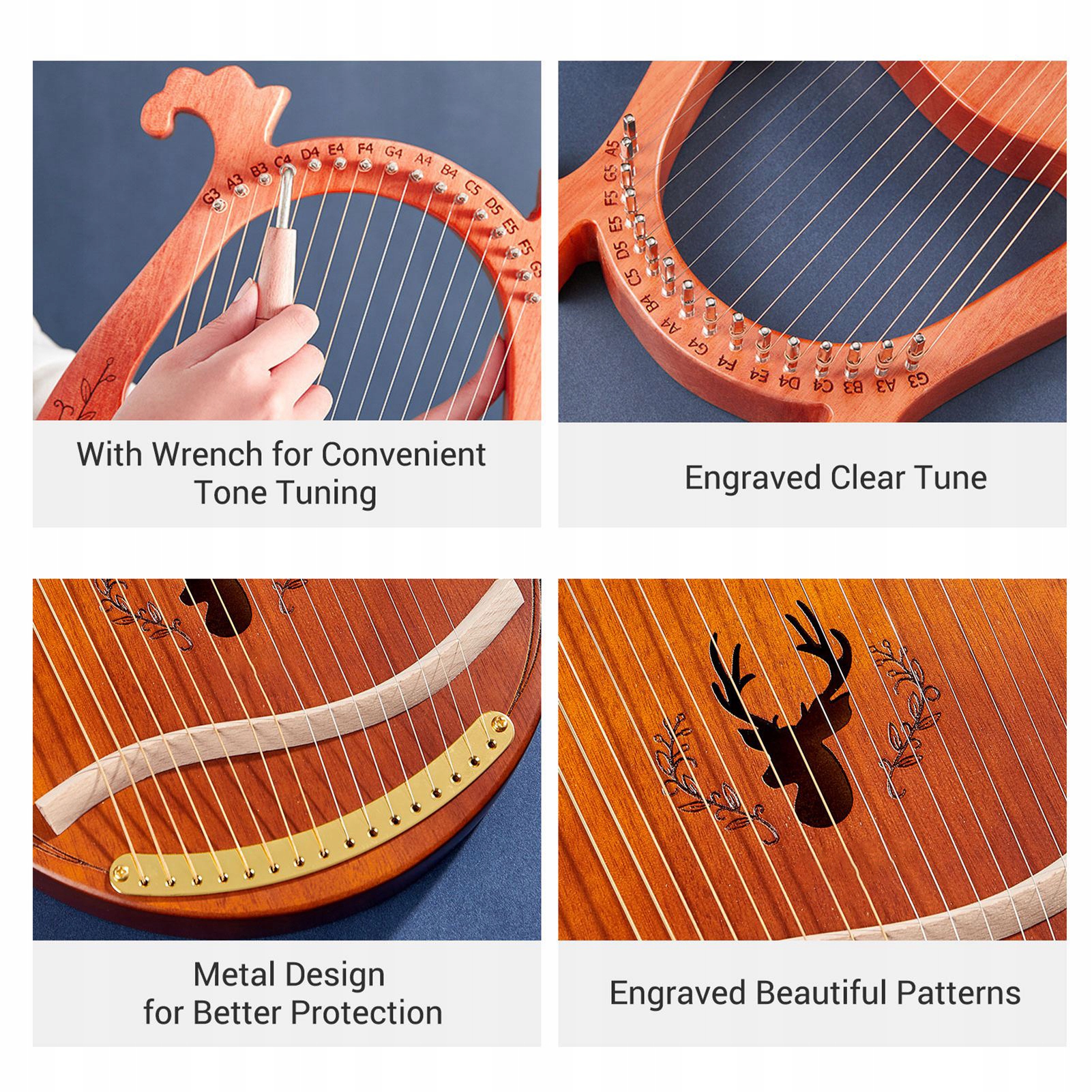 - Lyre Harp із клавішею 16 має дерев’яну звукову коробку та міцні сталеві струни, насиченіші та тепліші, приємне музичне розслаблення для вас.