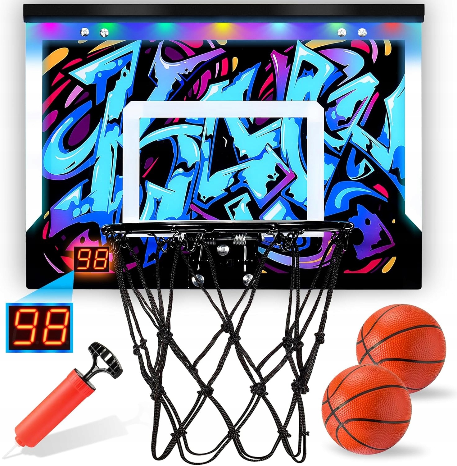 - Міні-баскетбольний м'яч розміром 30 x 30 см виготовлений з високоякісного прозорого полікарбонату з крутими графіті та світловими ефектами. Він має пристрасний початковий звук, а дошка стійка до тріщин і міцна. Захисна підкладка з піни на задній стінці та підставці мінімізує шум біля дверей, в офісі та у вітальні.