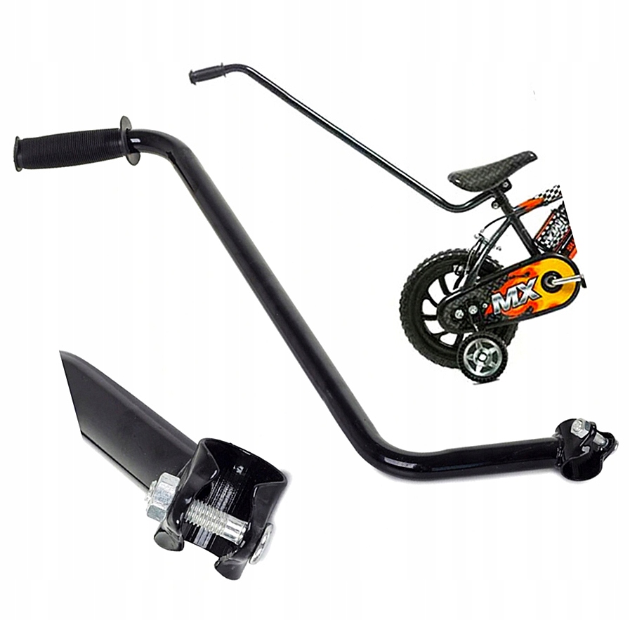 Він встановлений під сідлом велосипеда. Має гумову ручку, завдяки якій ви можете безпечно вести дитину на велосипеді.